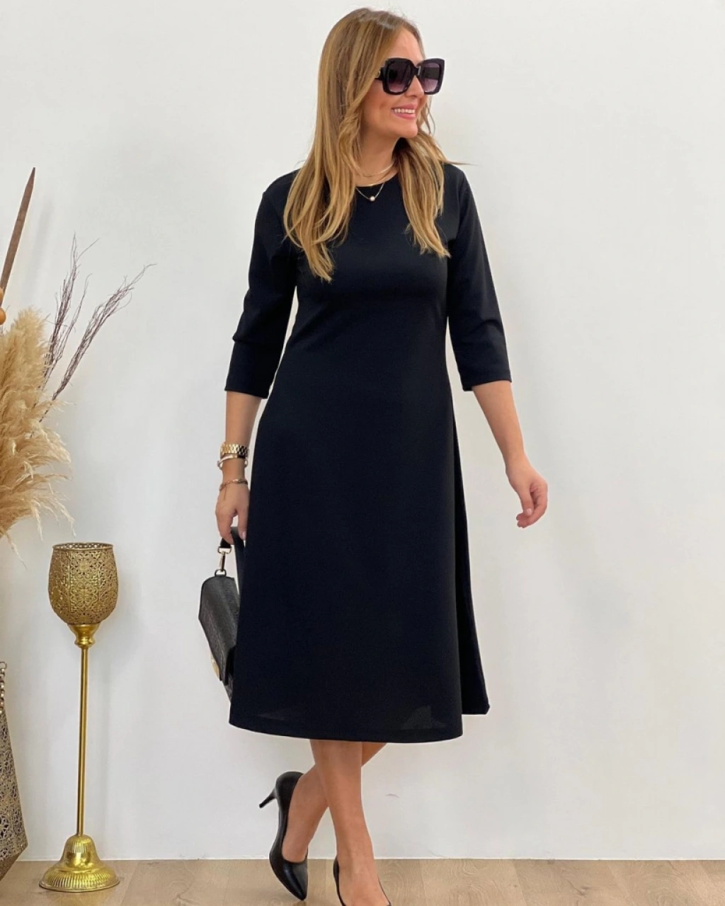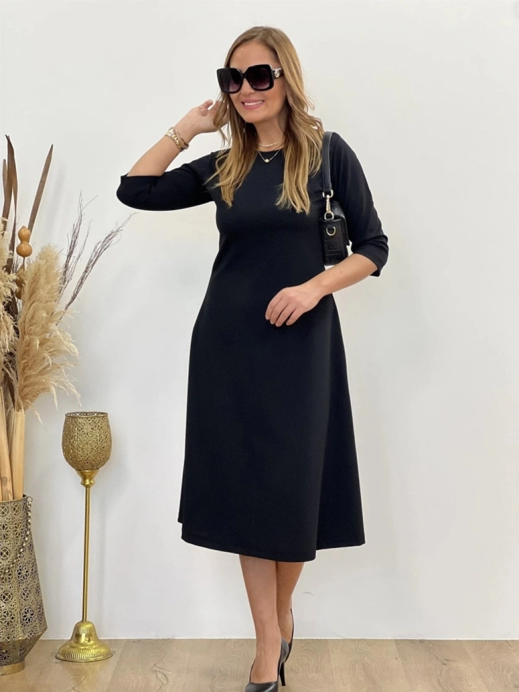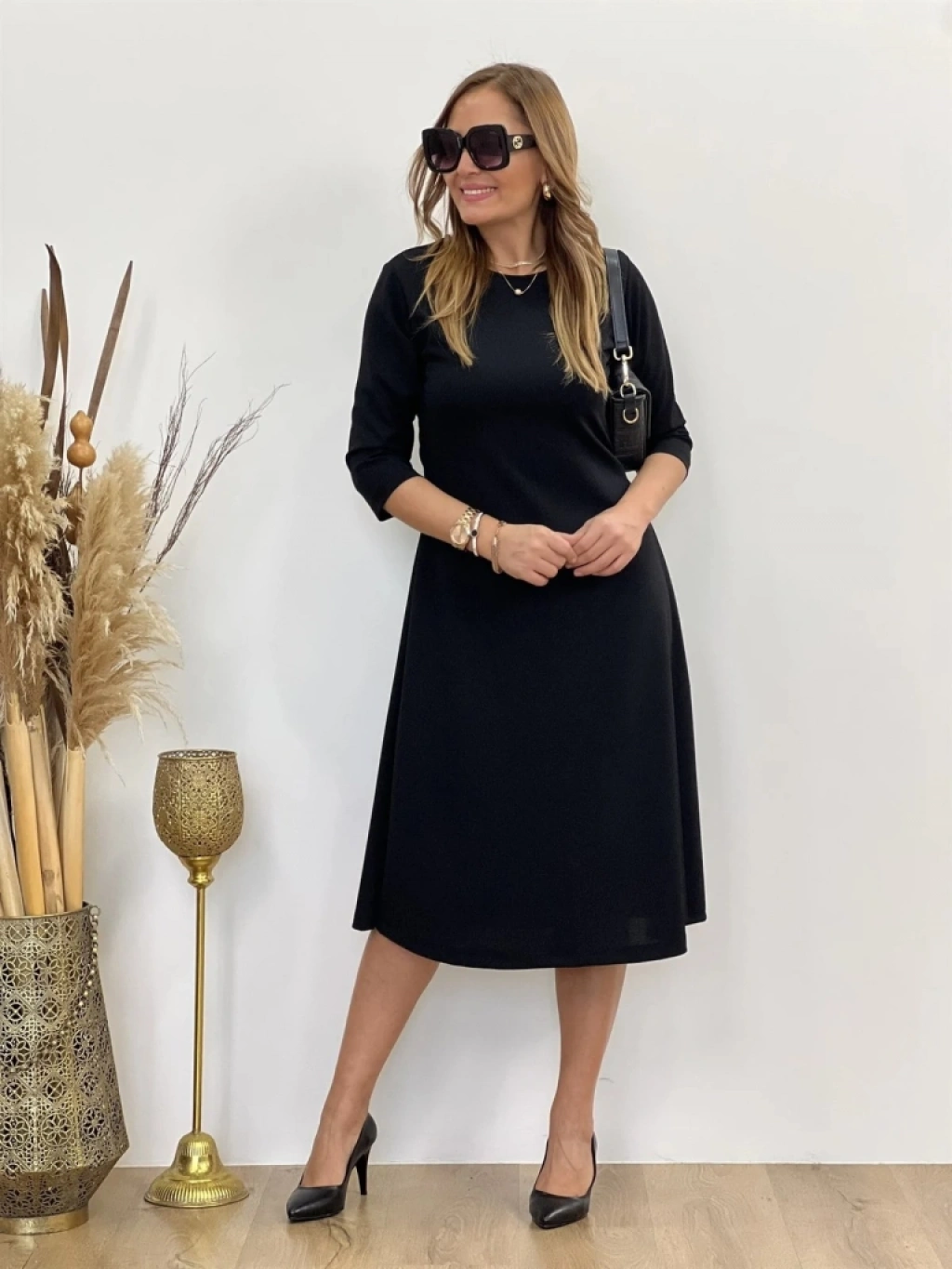 Kadın Uzun Truvakar Kol Bisiklet Yaka Midi Modal Elbise