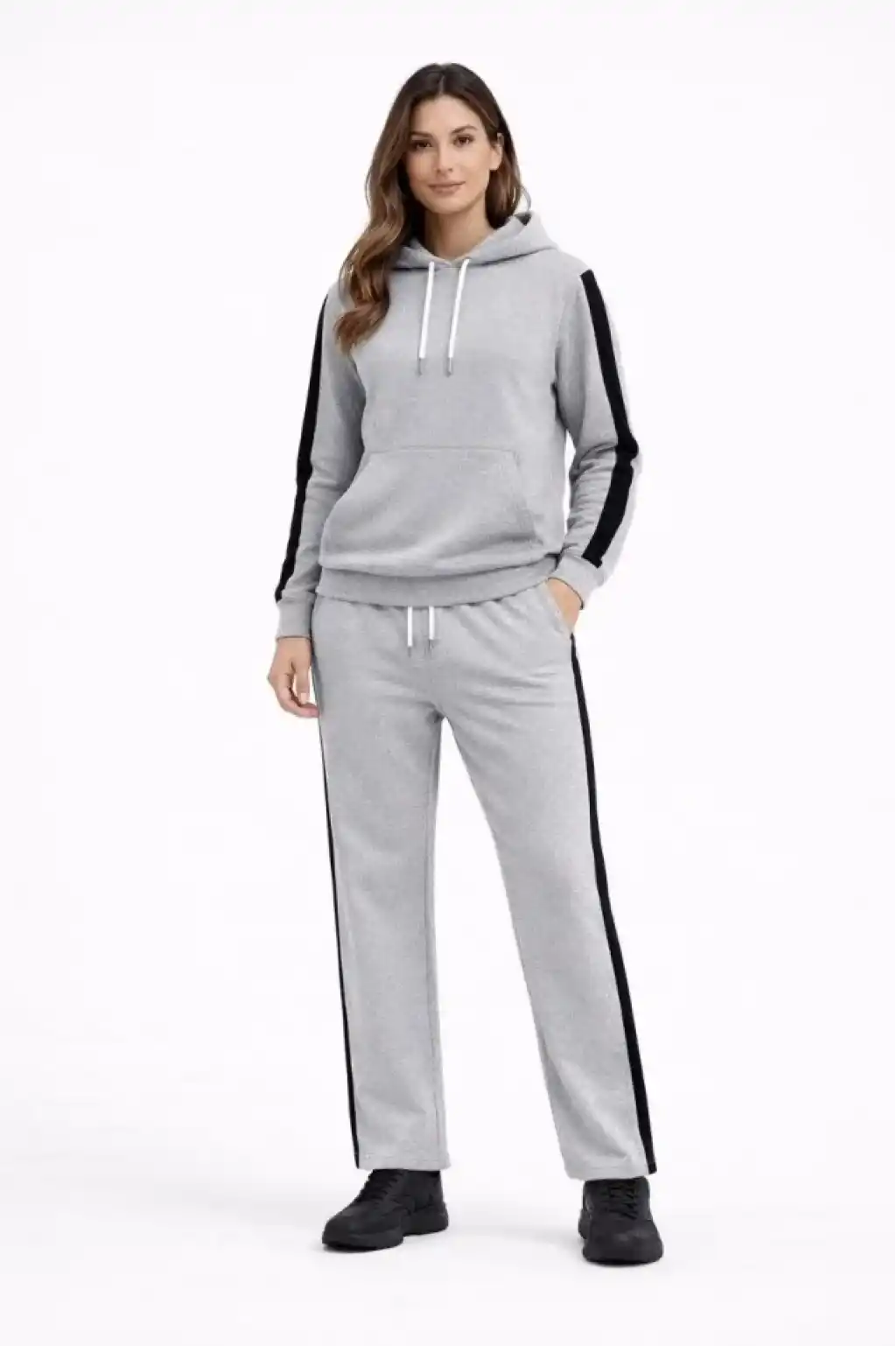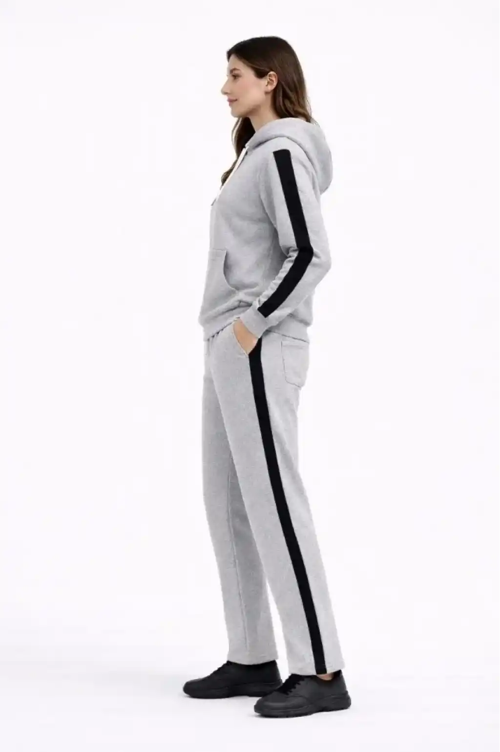 KADIN Yandan Şeritli Eşofman Takım Kapüşonlu Sweatshirt Boru Paça Alt, Oversize 3 Iplik Pamuklu - Gri