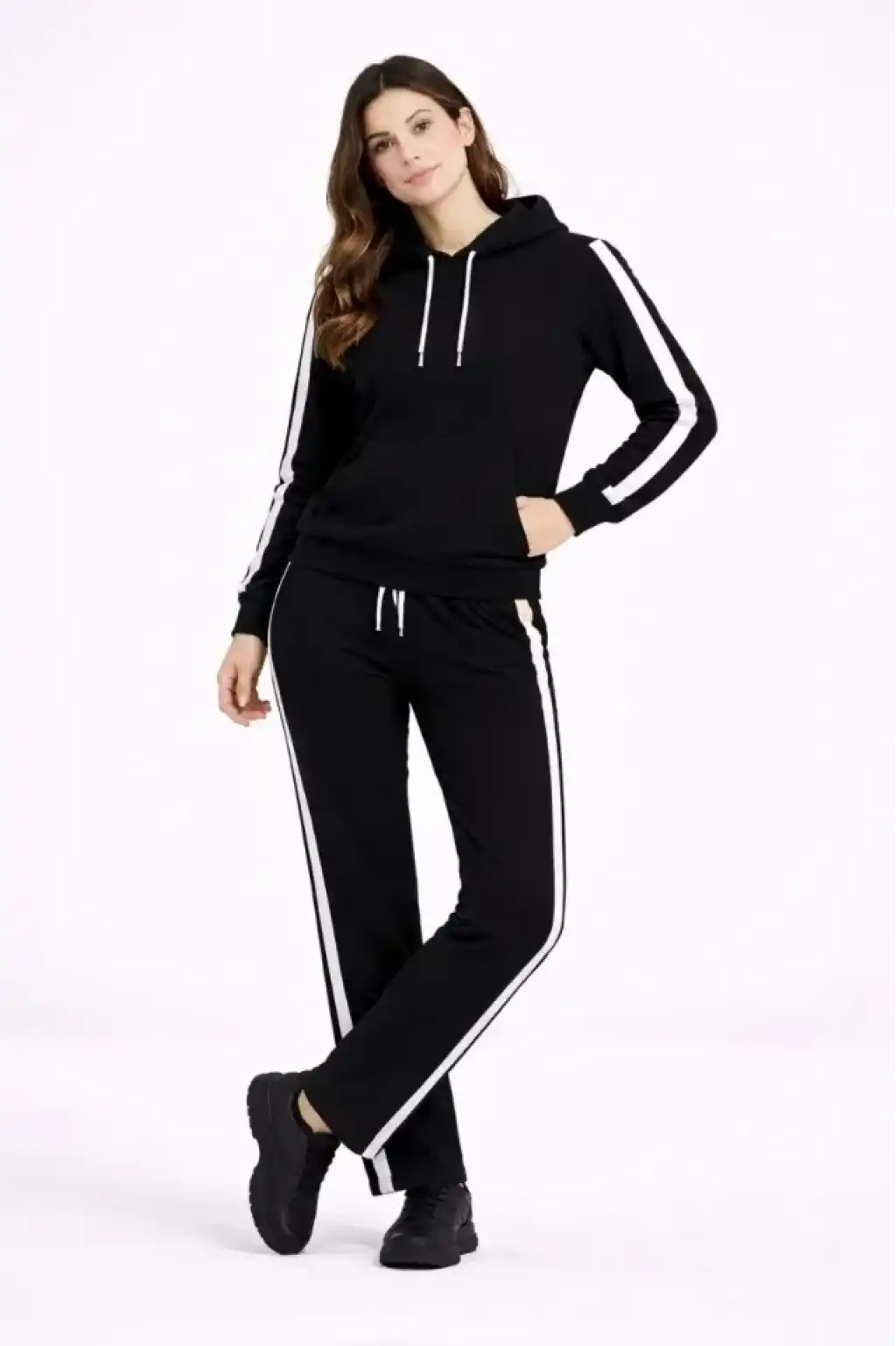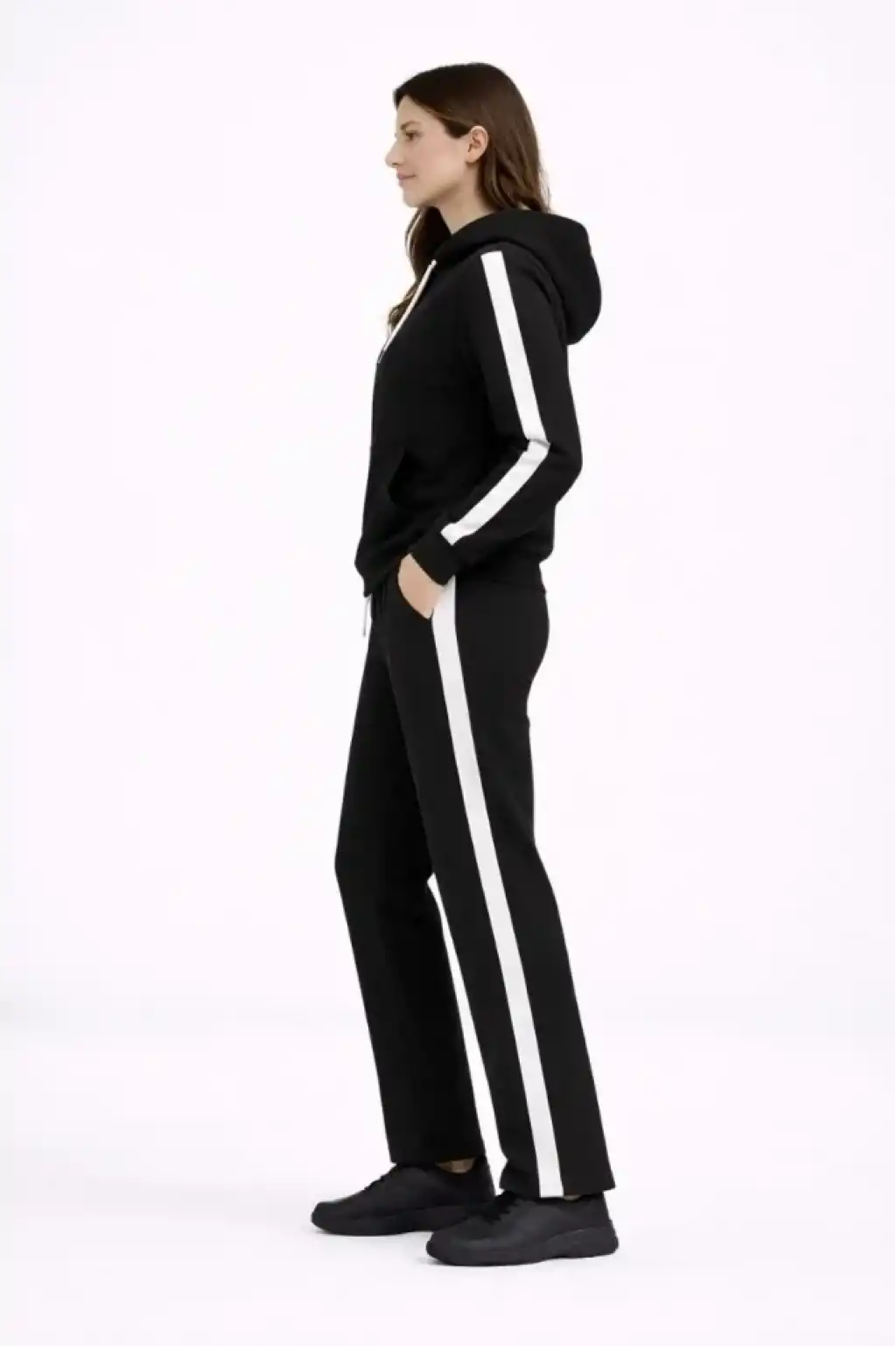 KADIN Yandan Şeritli Eşofman Takım Kapüşonlu Sweatshirt Boru Paça Alt, Oversize 3 Iplik Pamuklu - Siyah
