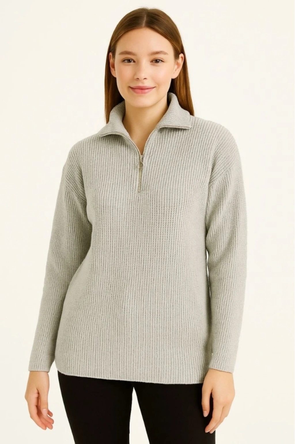 KADIN Yarım Fermuarlı Triko Kazak – Selanik Örgü, Dik Yaka, Pamuklu Dokuma, Regular Fit Uzun Kollu Kışlık Model - Gri