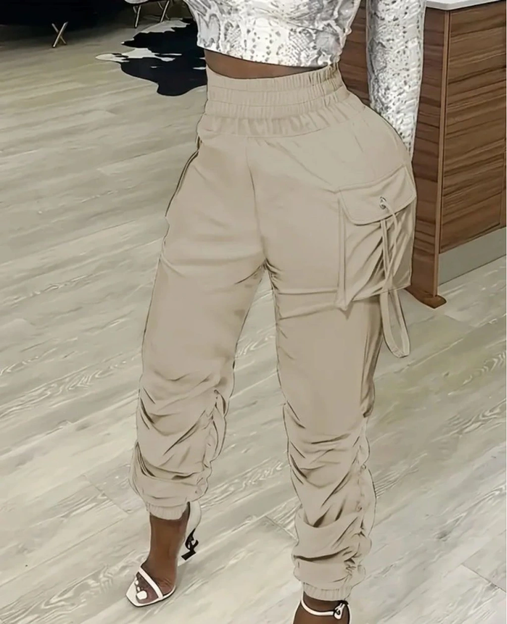 Kadın Yüksek Bel Beli Lastikli Kargo Cep Detaylı Gabardin Pantolon