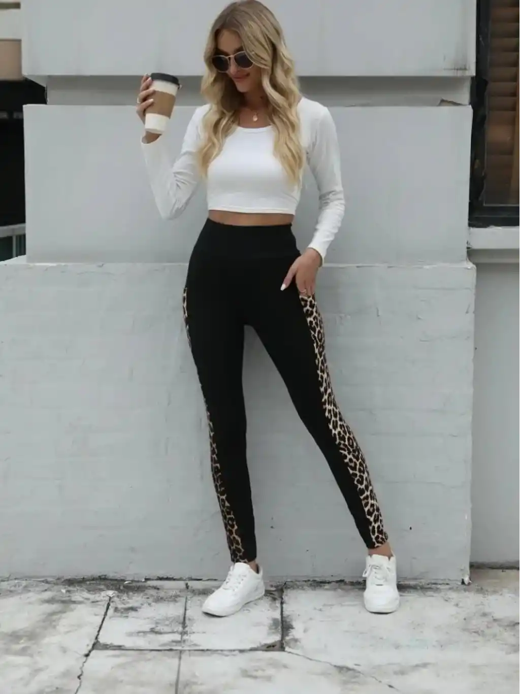Kadın Yüksek Bel Cep Detaylı Leopar Desenli Dalgıç Tayt