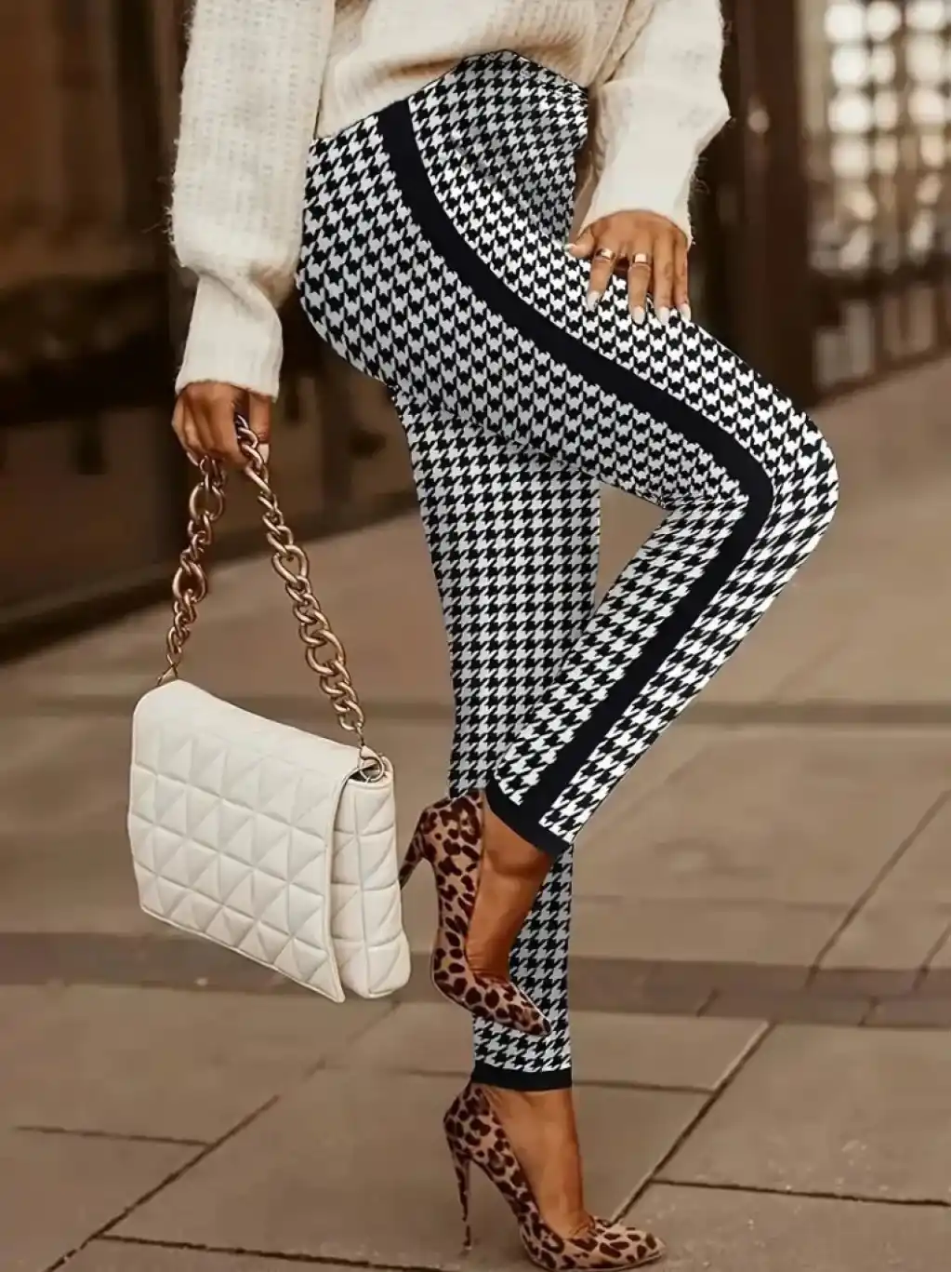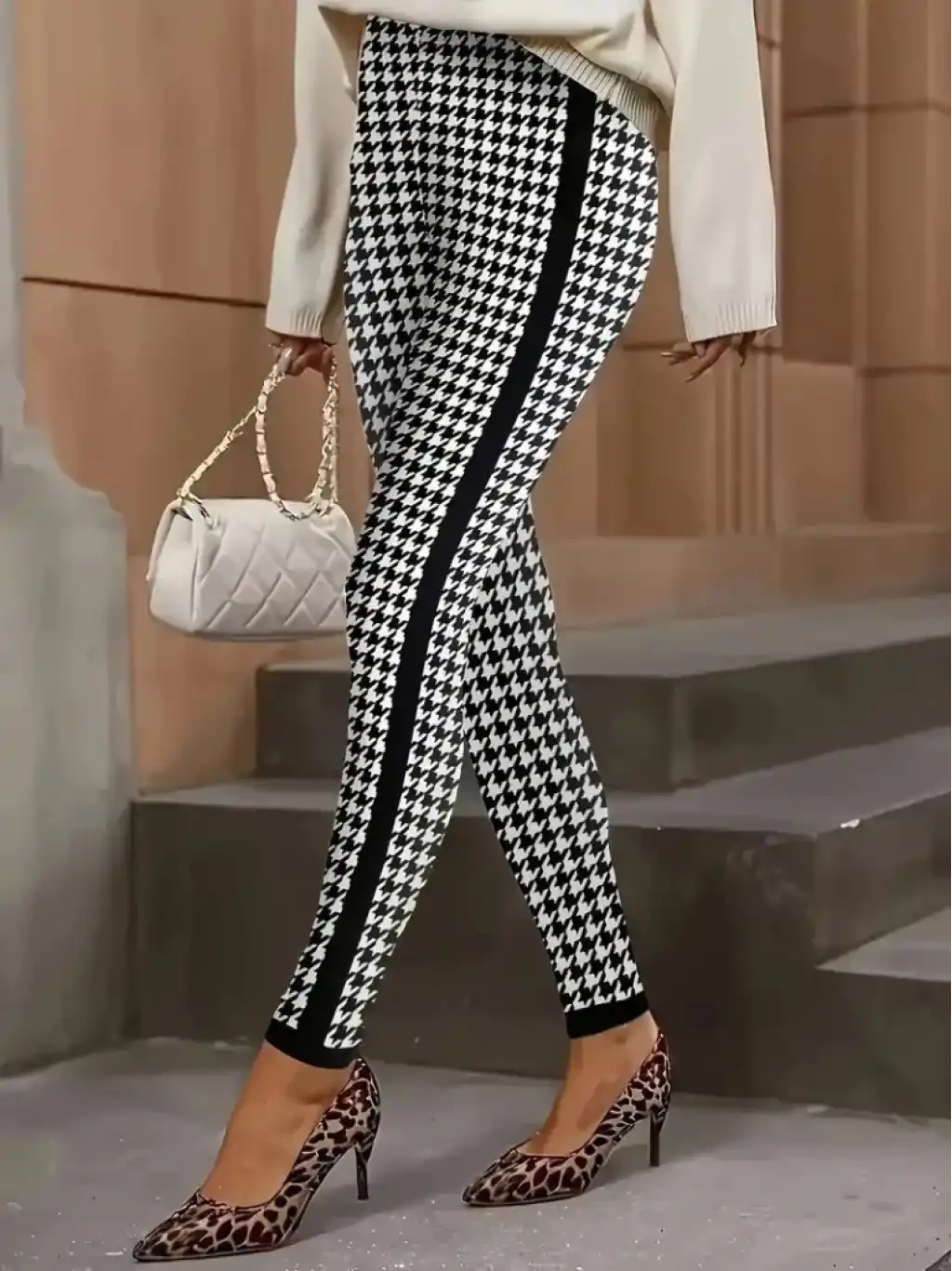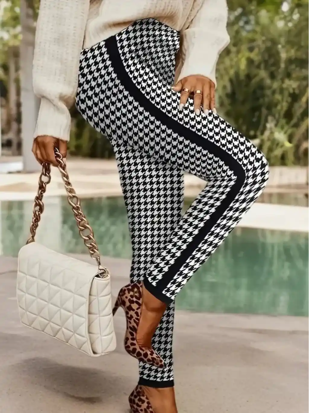 Kadın Yüksek Bel Kaz Ayağı Desenli Yanları şeritli Dalgıç Pantolon