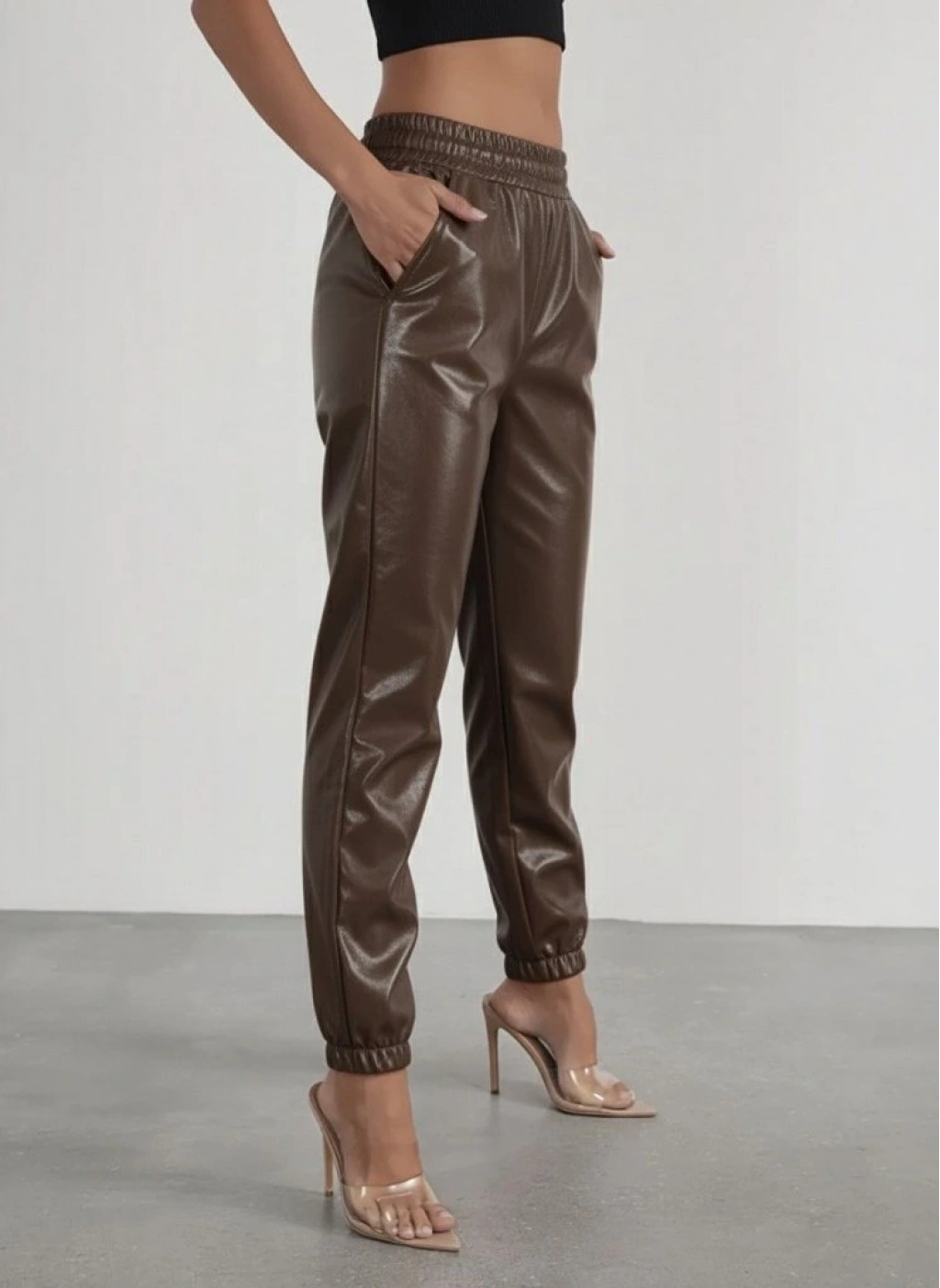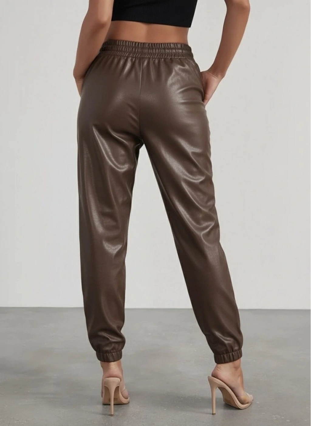 Kadın Yüksek Bel Lastikli önü Düğmeli Deri Pantolon