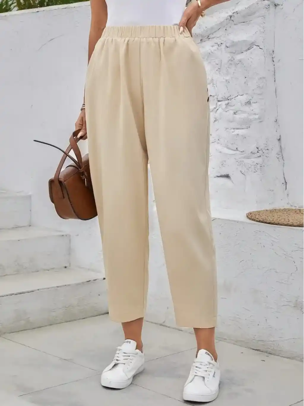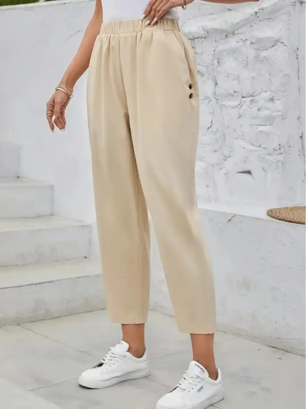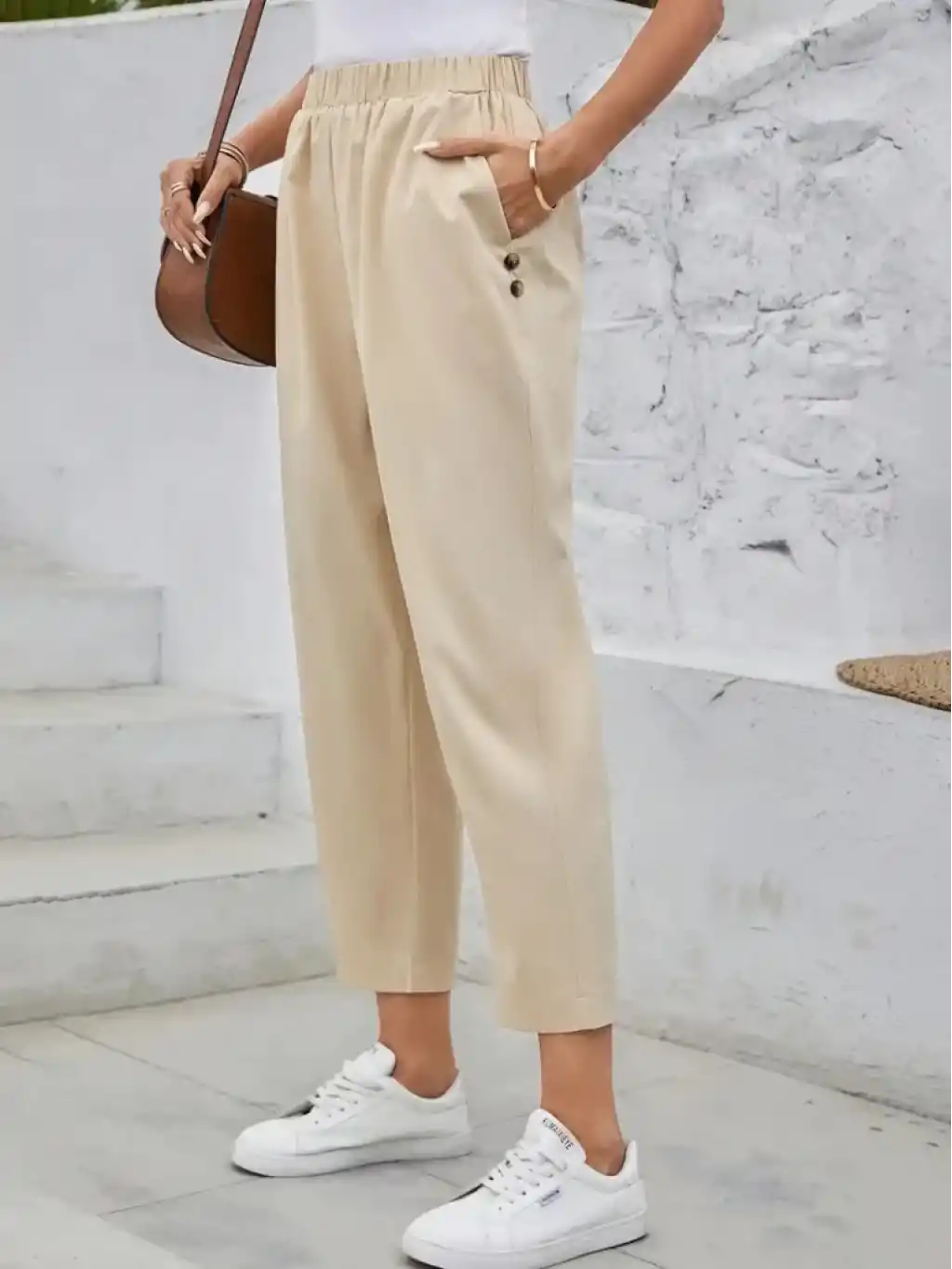 Kadın Yüksek Bel Yandan Cepli Düğme Detaylı Geniş Kesim Ithal Krep Pantolon
