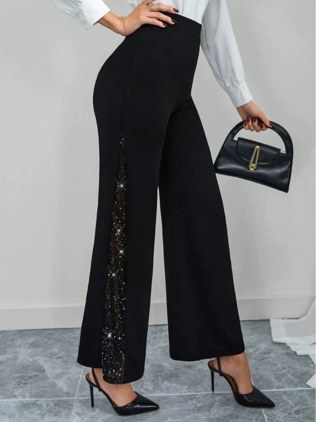 Kadın Yüksek Bel Yanlardan Tül Detaylı Ithal Krep Pantolon