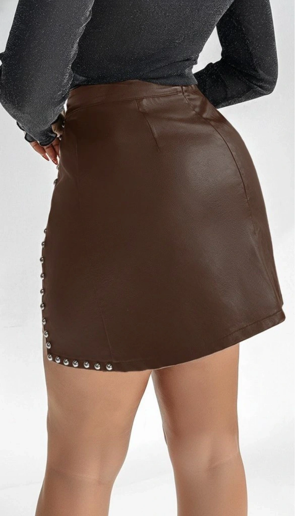 Kadın Yüksek Belli Yandan çivili Mini Deri Etek
