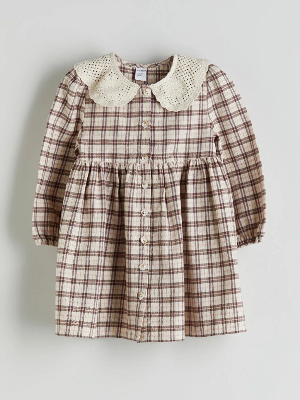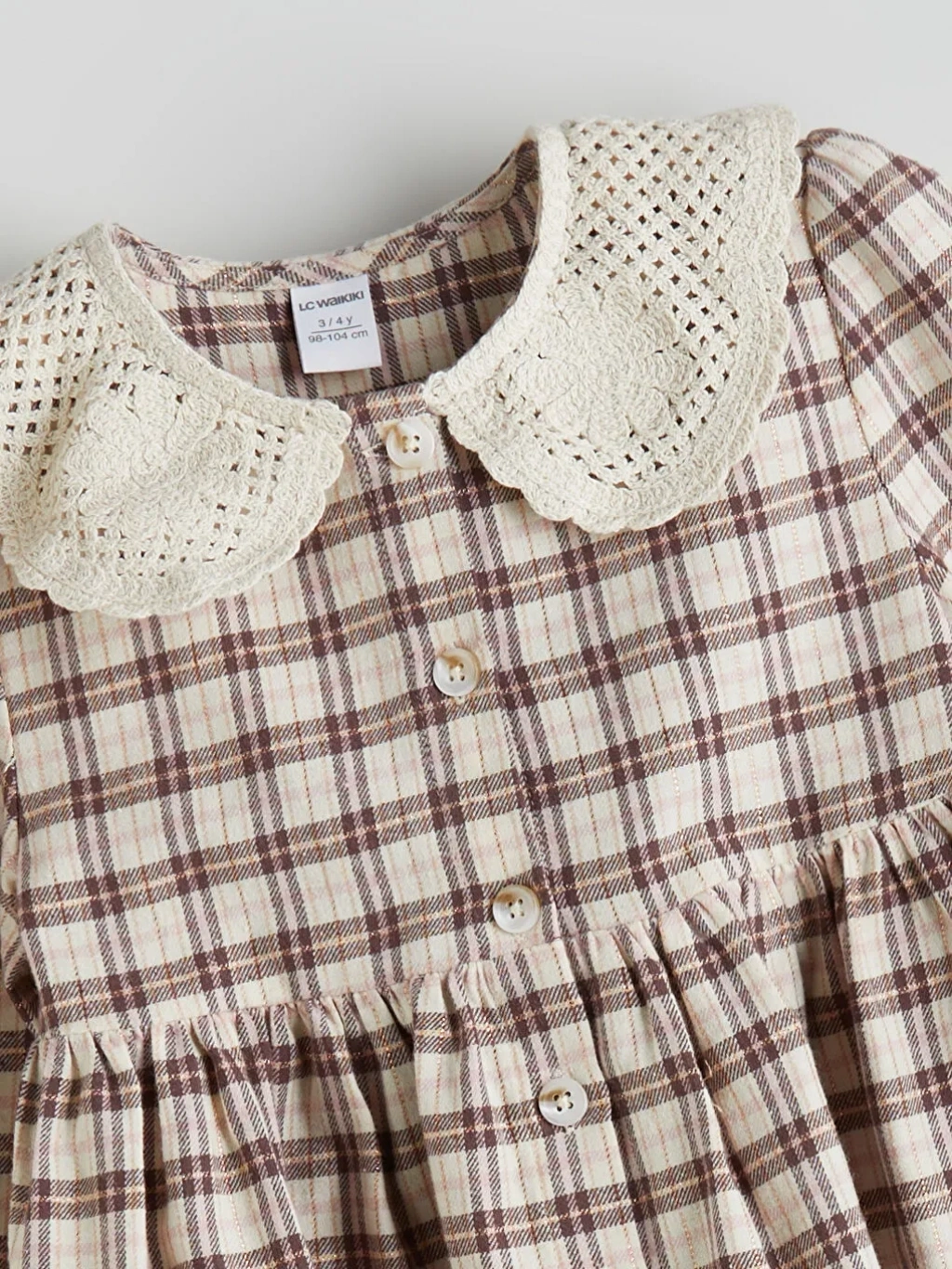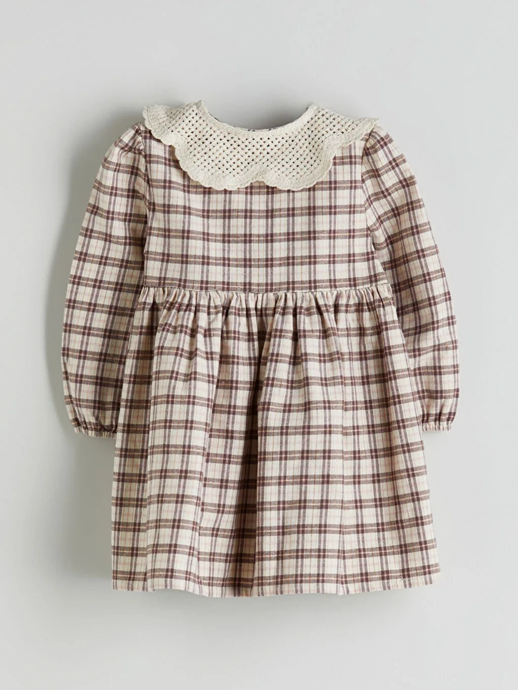 Kids Bej Bebe Yaka Ekose Desen Flanel Kız Çocuk Elbise