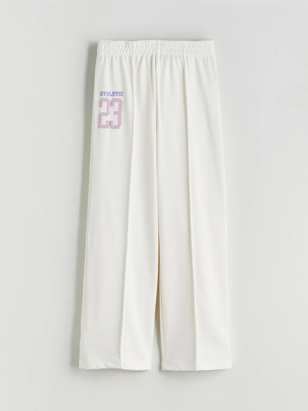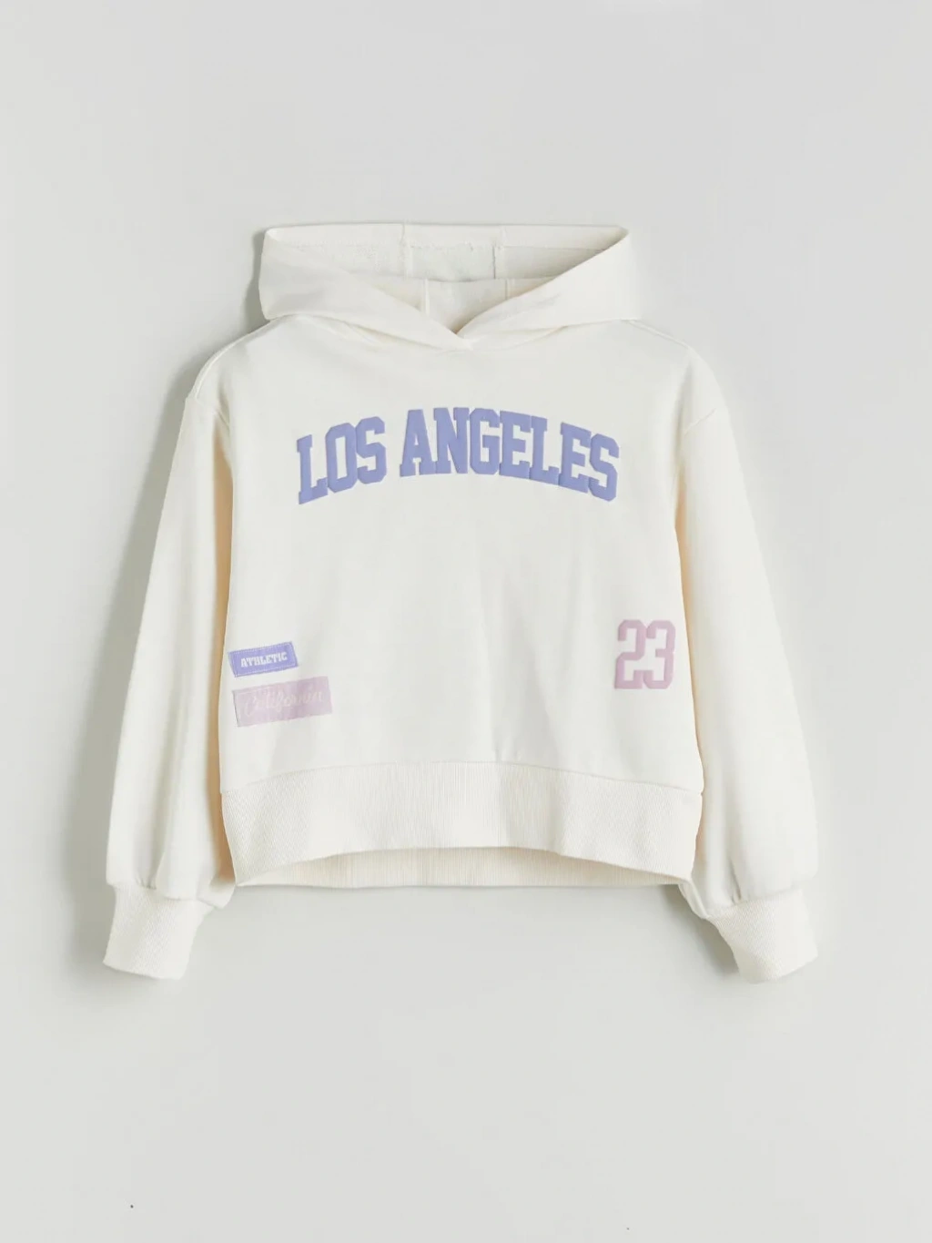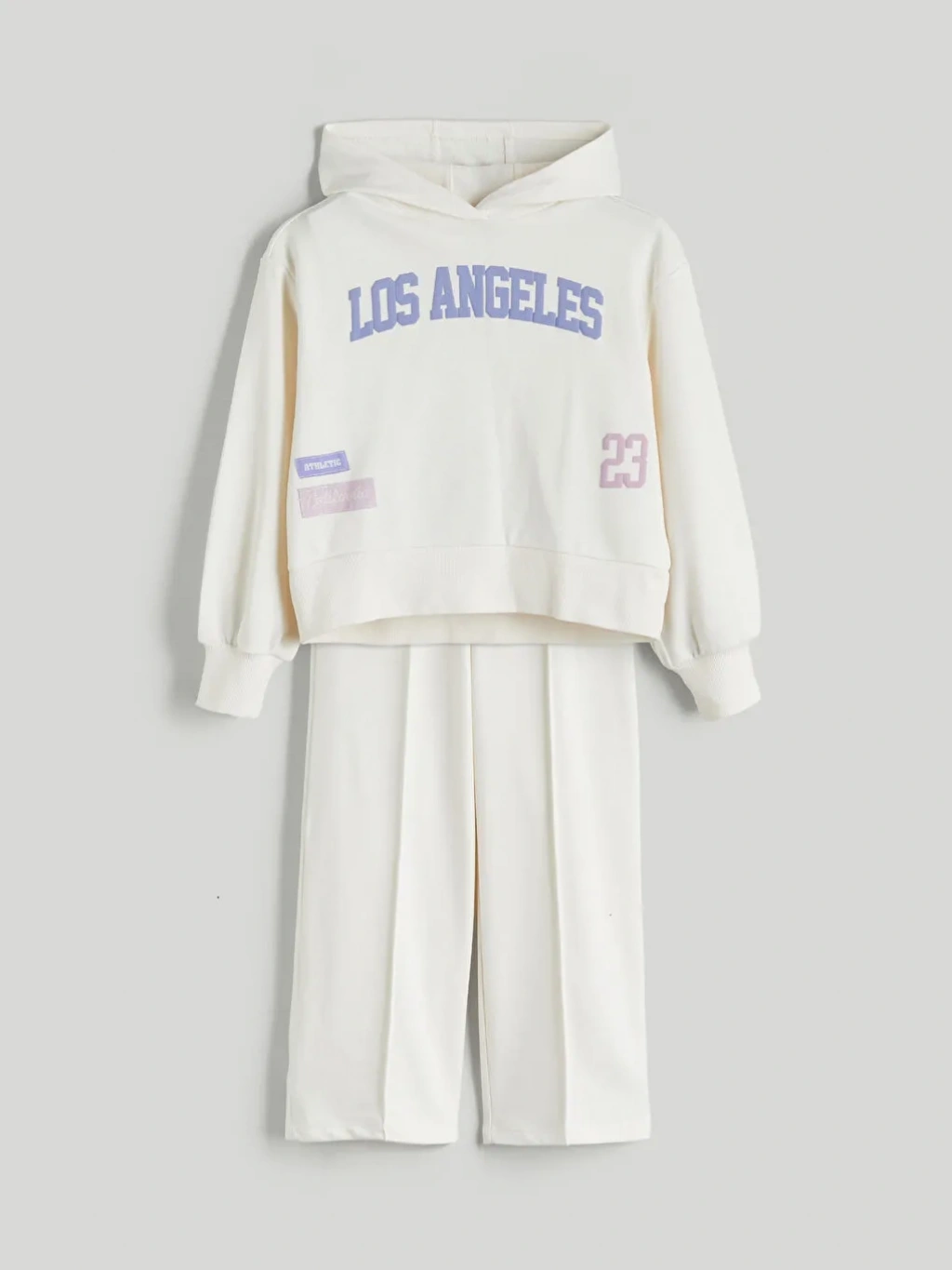 Kız çocuk eşofman takımı, kapüşonlu, uzun kollu, baskılı sweatshirt ve beli lastikli eşofman altından oluşur.