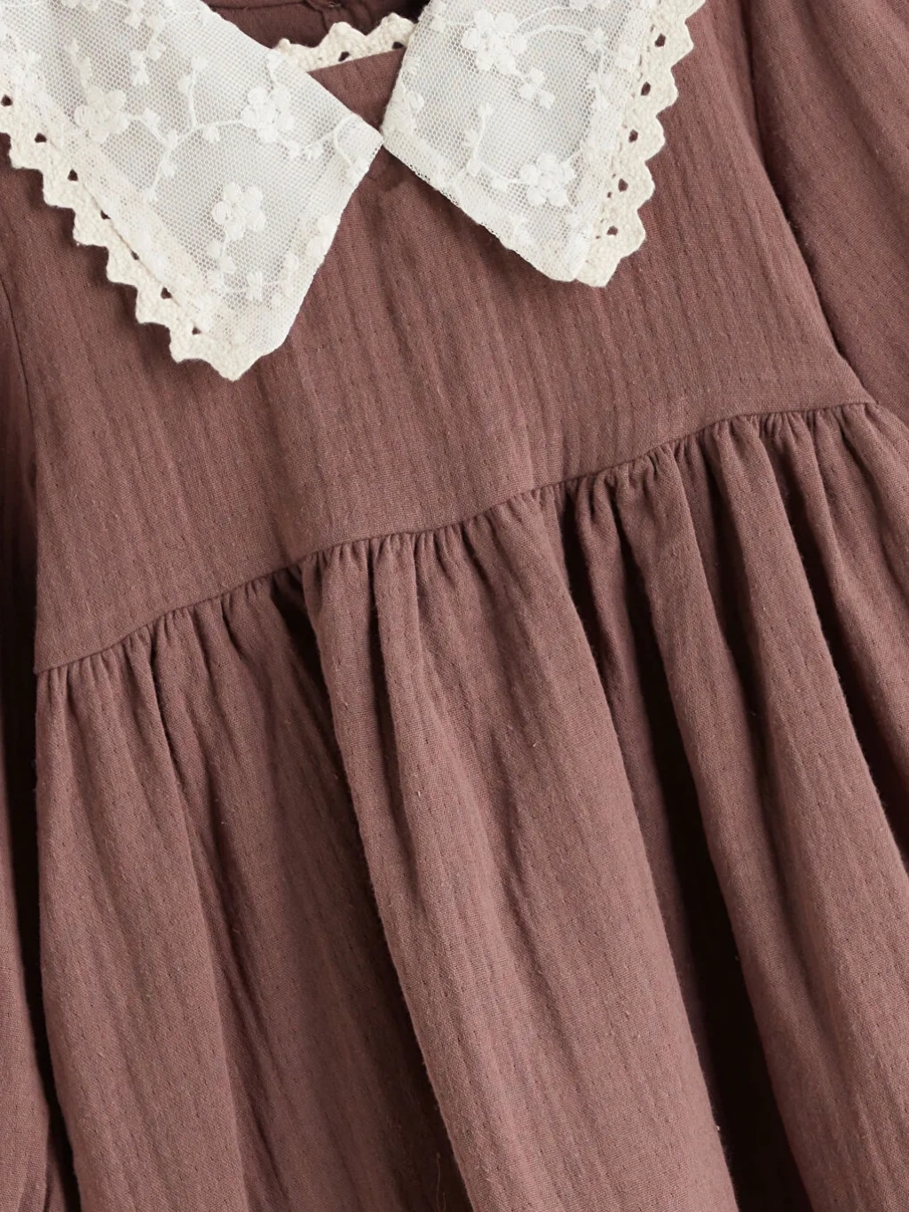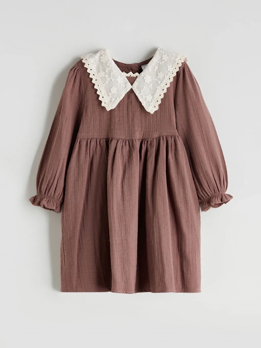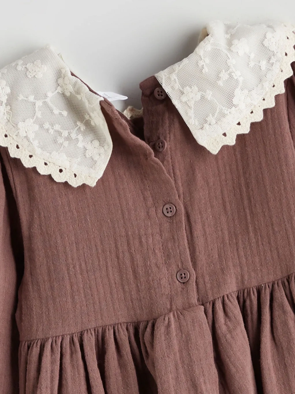 Kids Kahverengi Dantelli Bebe Yaka Pamuklu Kız Çocuk Müslin Elbise