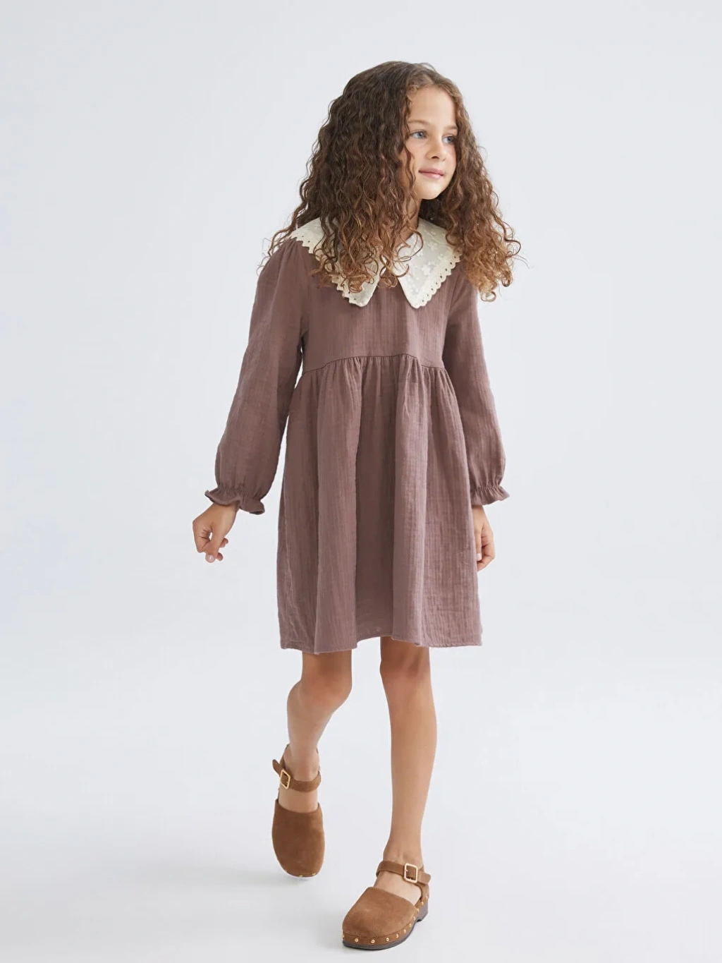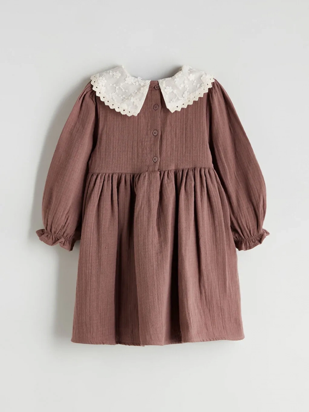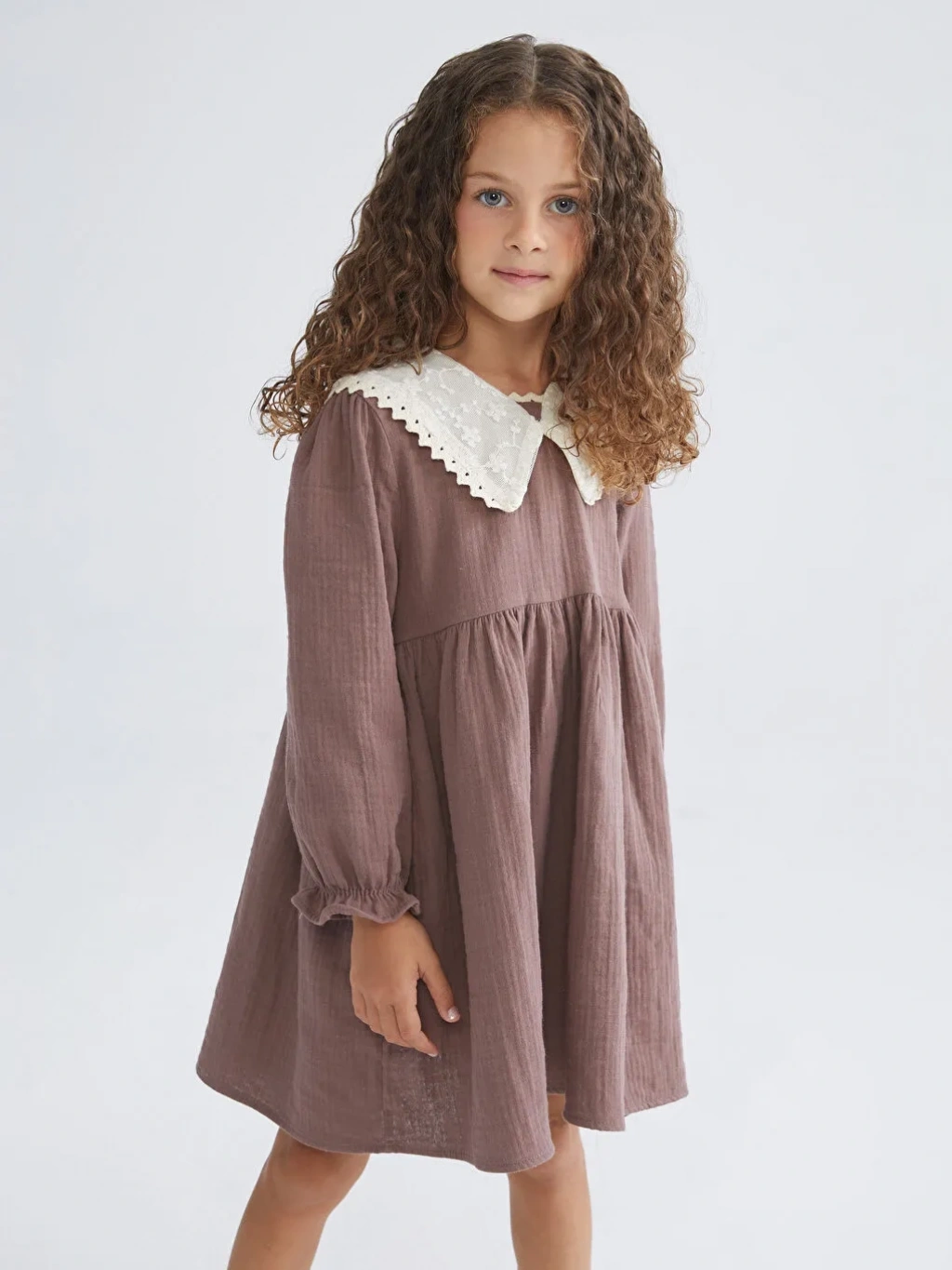 Kids Kahverengi Dantelli Bebe Yaka Pamuklu Kız Çocuk Müslin Elbise