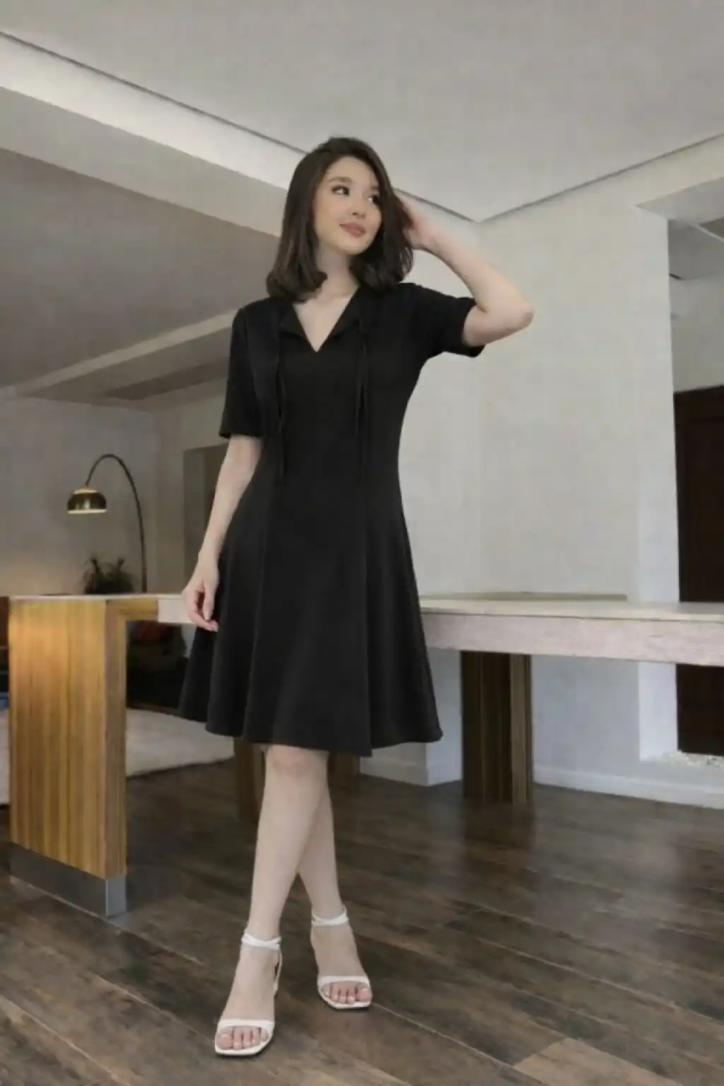 Kısa Kollu Yakası Bağcık Detay Atlas Kumaş Elbise