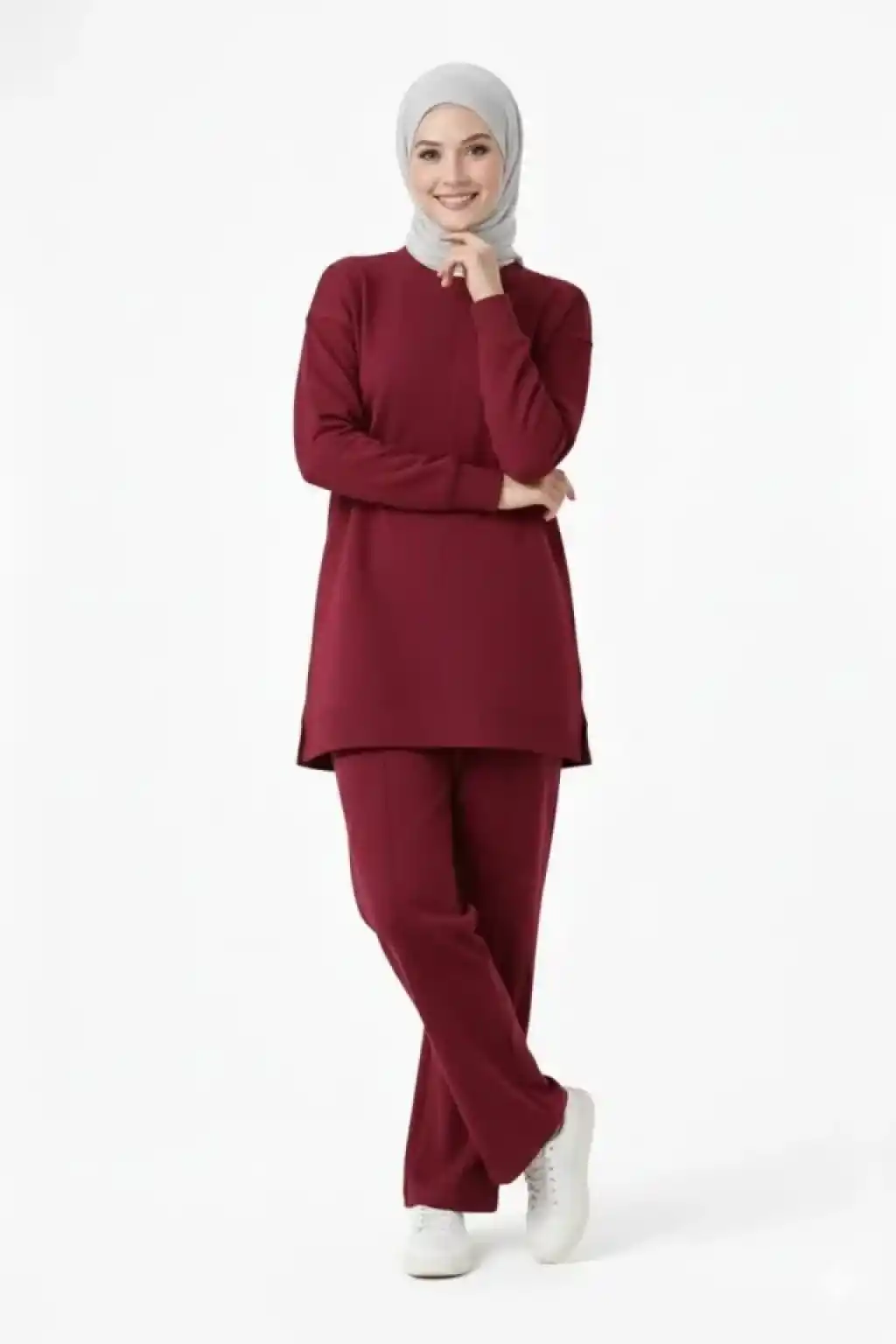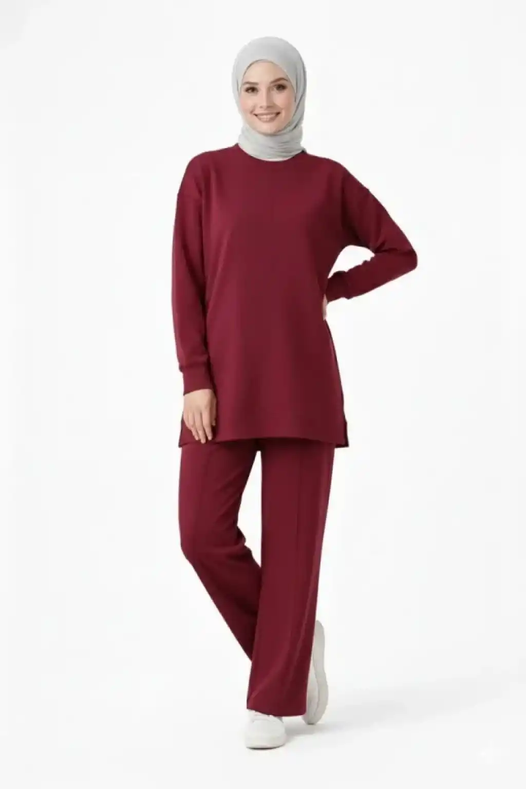 Osy Modal Yumuşak Dokulu Tesettür İkili Takım Yan Yırtmaçlı Uzun Tunik Ve Düz Paça Pantolon, Salaş Kalıp - Bordo