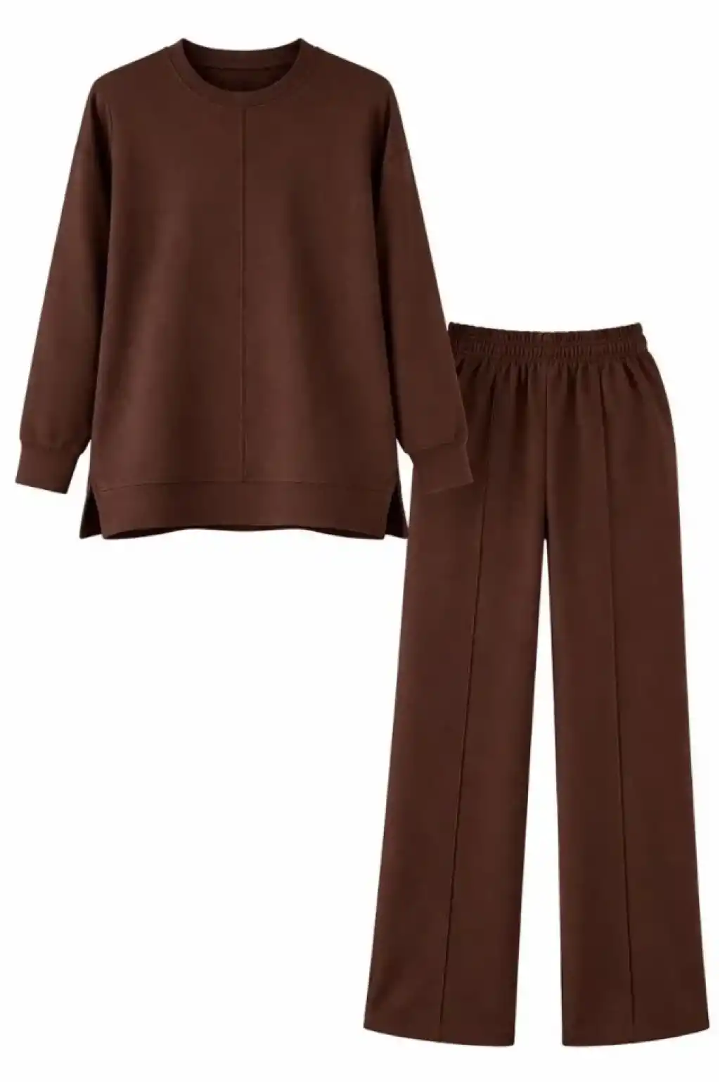 Osy Modal Yumuşak Dokulu Tesettür İkili Takım Yan Yırtmaçlı Uzun Tunik Ve Düz Paça Pantolon, Salaş Kalıp - Kahverengi