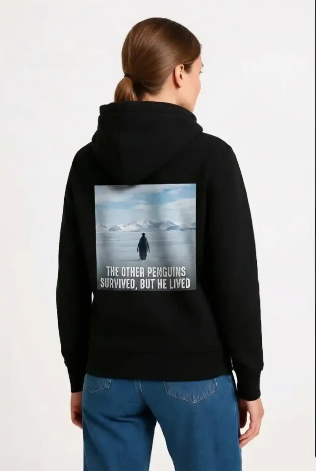 Oversize Hoodie - Sırt Baskılı Survivor Penguin Temalı, Felsefi Yazılı Kapüşonlu Sweatshirt - Siyah