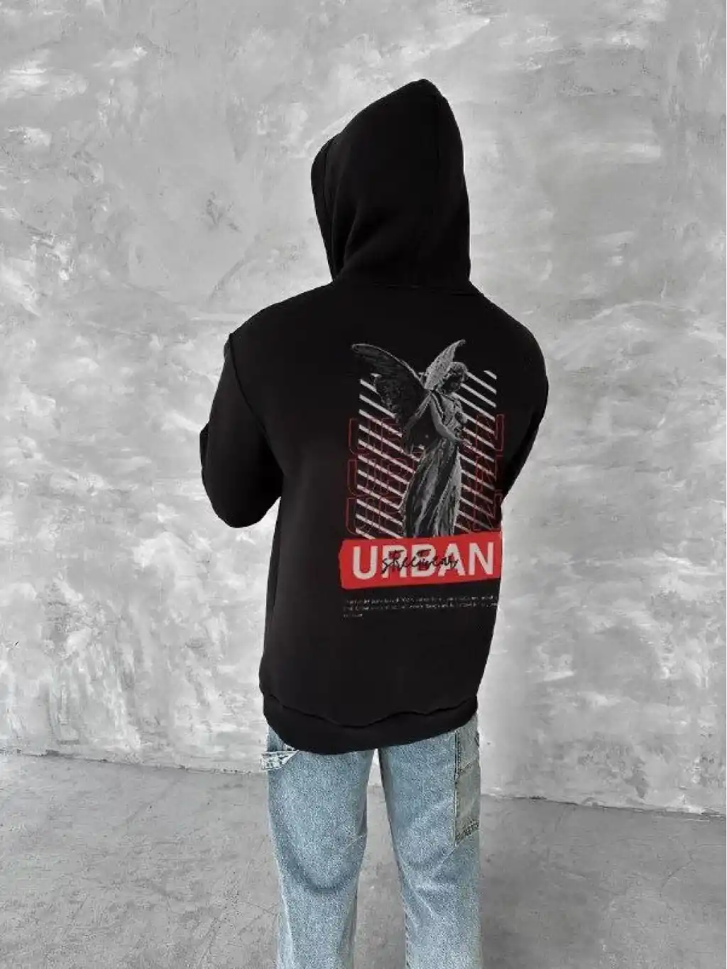 Erkek Sırt Baskılı Oversize Üç İplik Kapüşonlu Hoodie Sweatshirt - Siyah