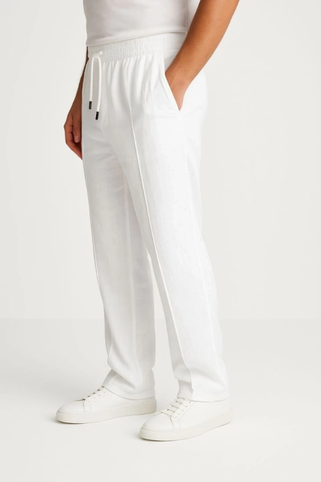 Erkek Keten Pantolon – Cepli, Beli Lastikli Ve Bağcıklı, Nefes Alan Rahat Kalıp, Yazlık Ve Baharlık Günlük Giyim, Şık & Konforlu Boru Paça Model - Beyaz