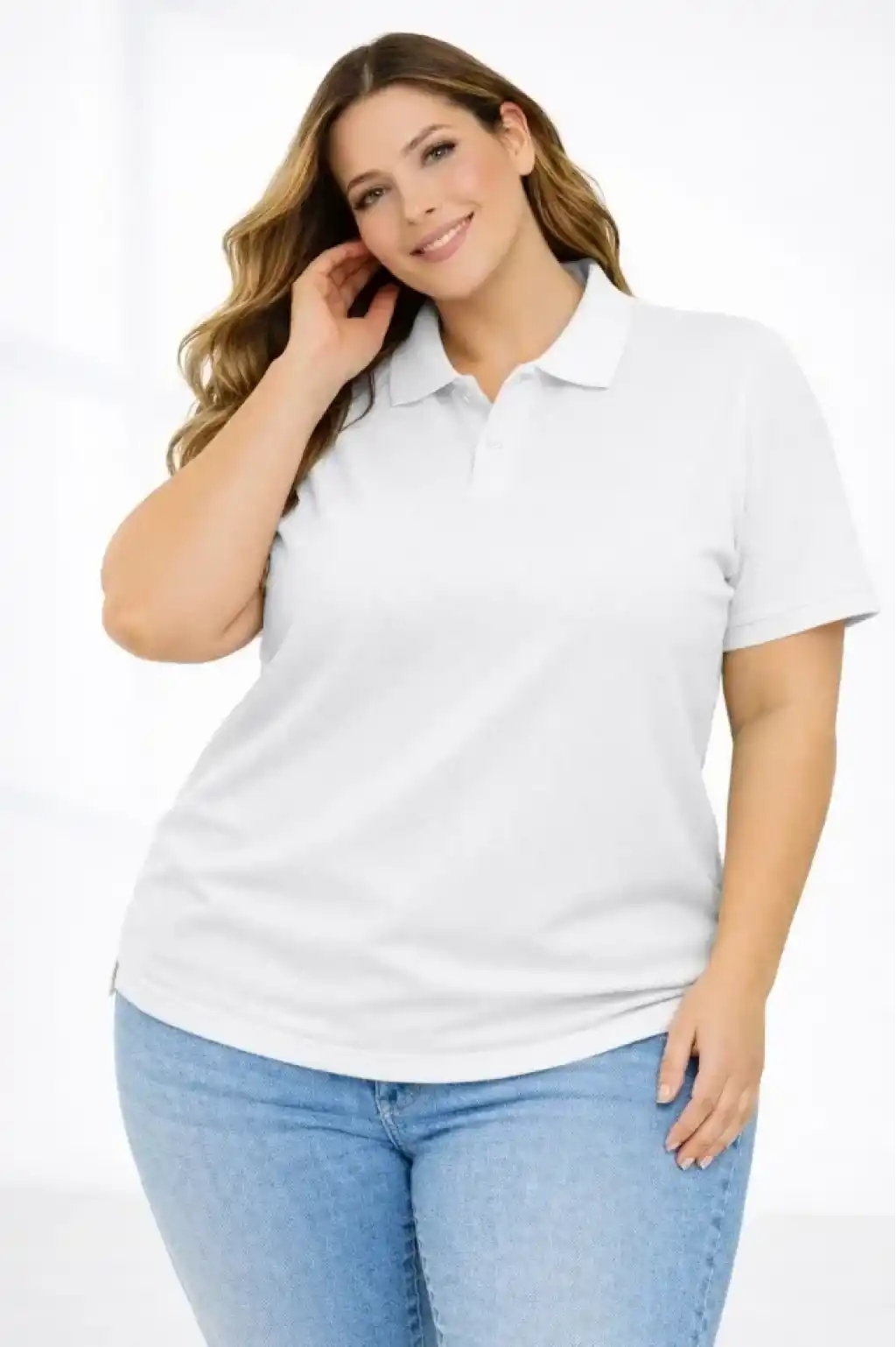 Pike Kumaş Düğmeli Yaka Battal Büyük Beden Günlük Kısa Kol Tişört T-shirt - Beyaz