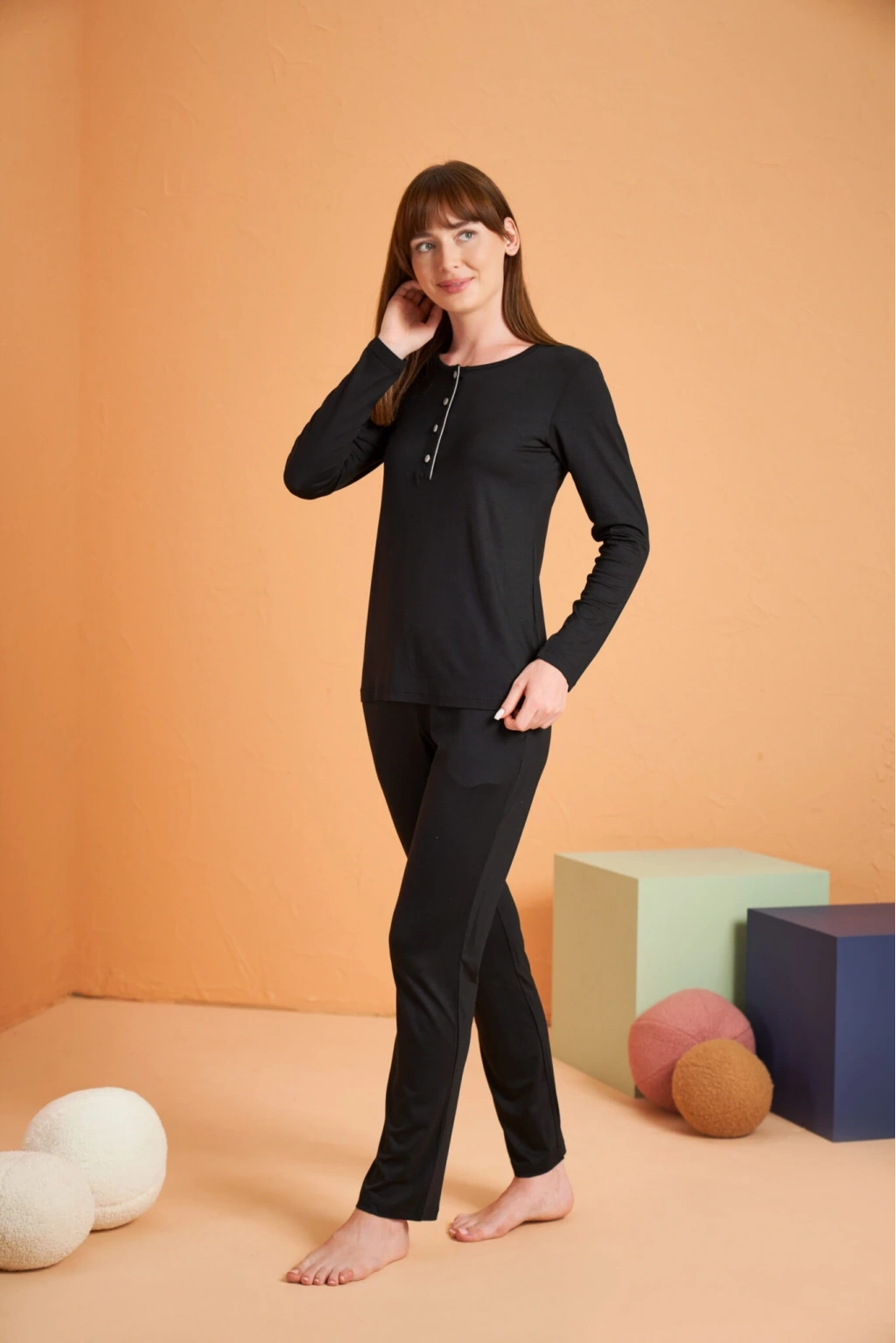 PJS 28049 Kadın Uzun Kol Önü Düğmeli Pijama Takım