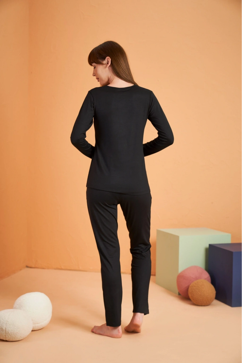 PJS 28081 Kadın Uzun Kol Yuvarlak Yaka Kalpli Pijama Takım