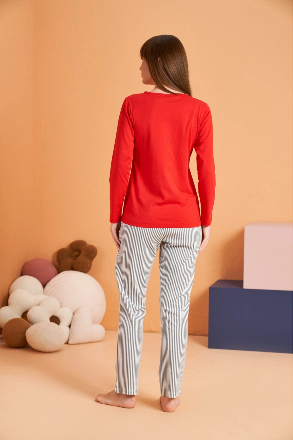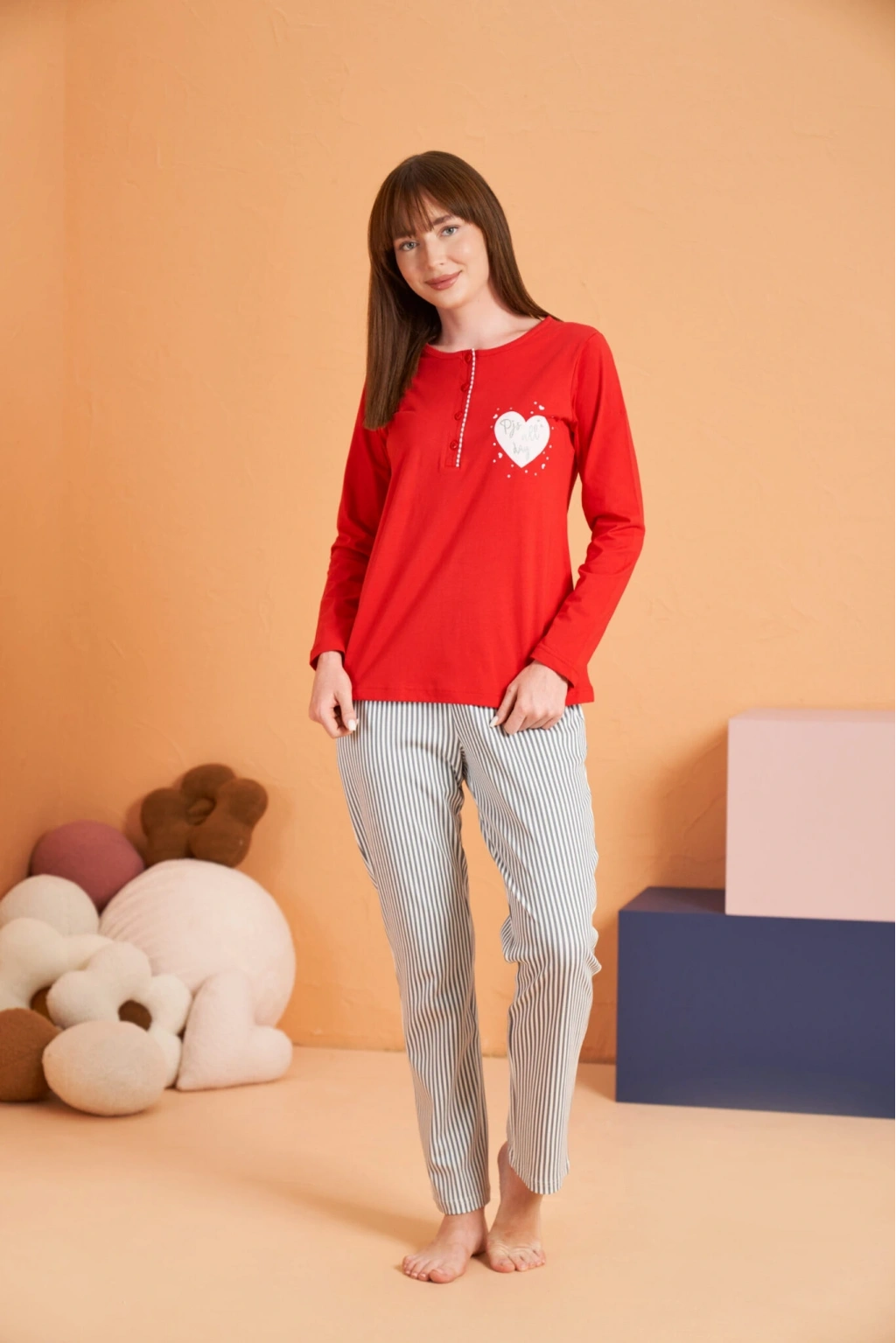 PJS 28081 Kadın Uzun Kol Yuvarlak Yaka Kalpli Pijama Takım