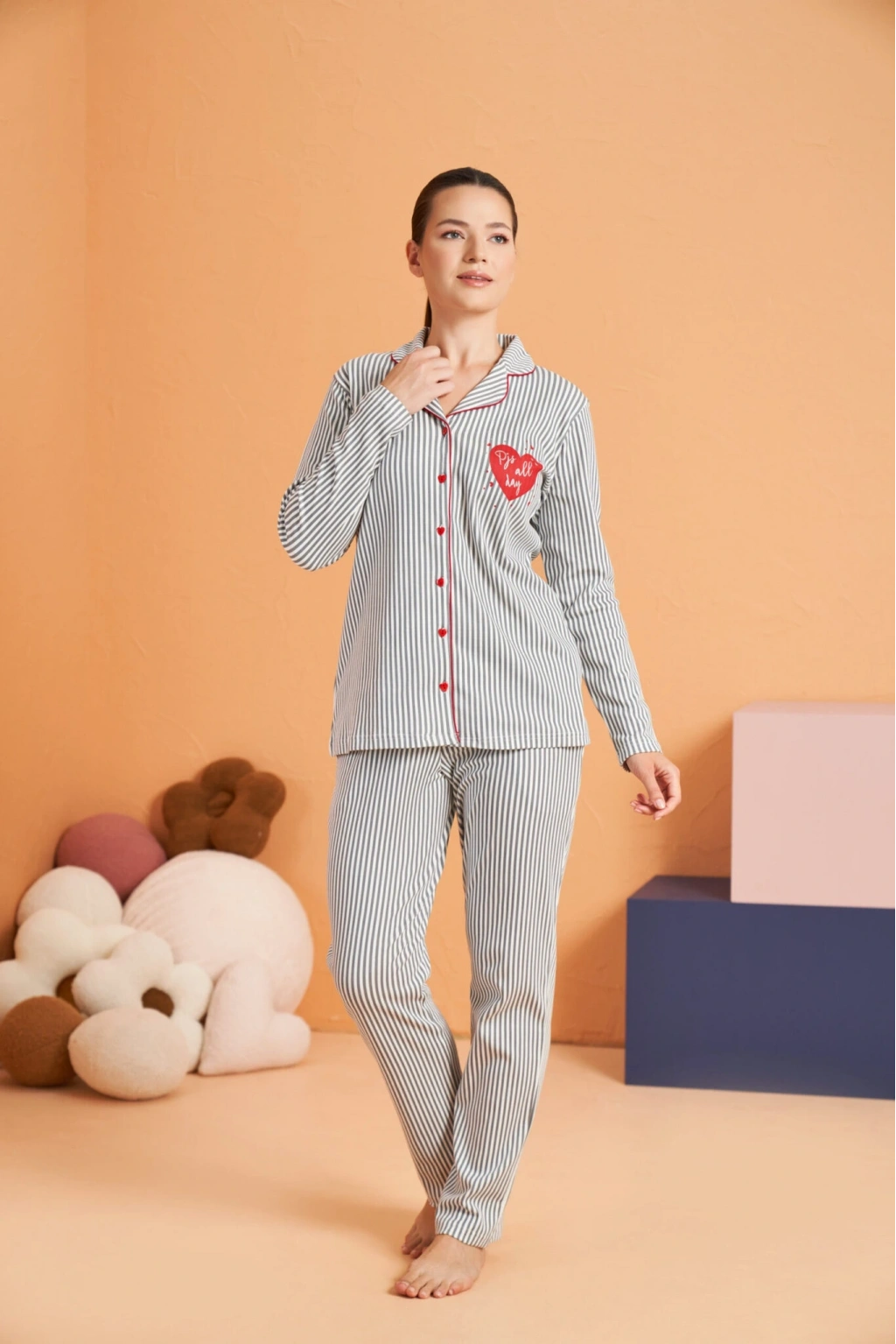 PJS 28081 Kadın Uzun Kol Yuvarlak Yaka Kalpli Pijama Takım