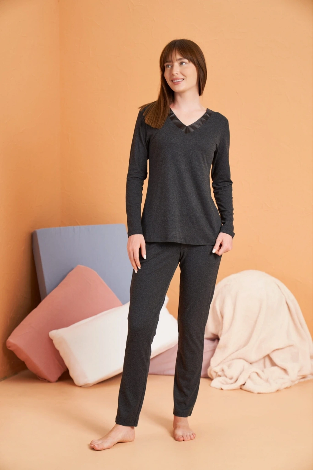 Pjs 28091 Kadın Uzun Kol V Yaka Pijama Takımı