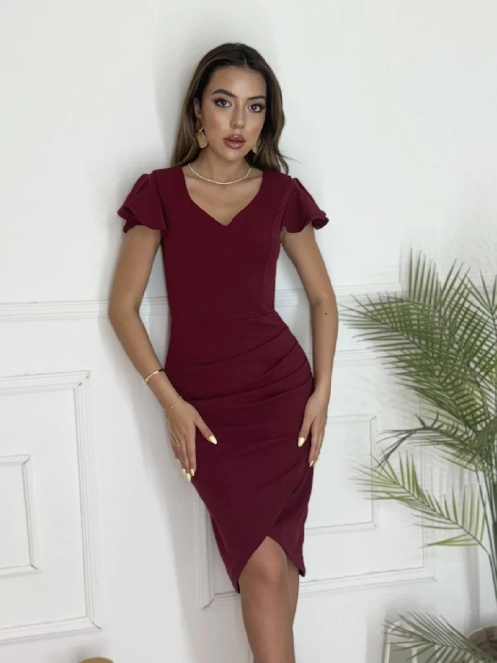 QKadın Kısa Kollu Kalp Yaka Yanlardan Büzgü Detay Midi Janjan Krep Elbise