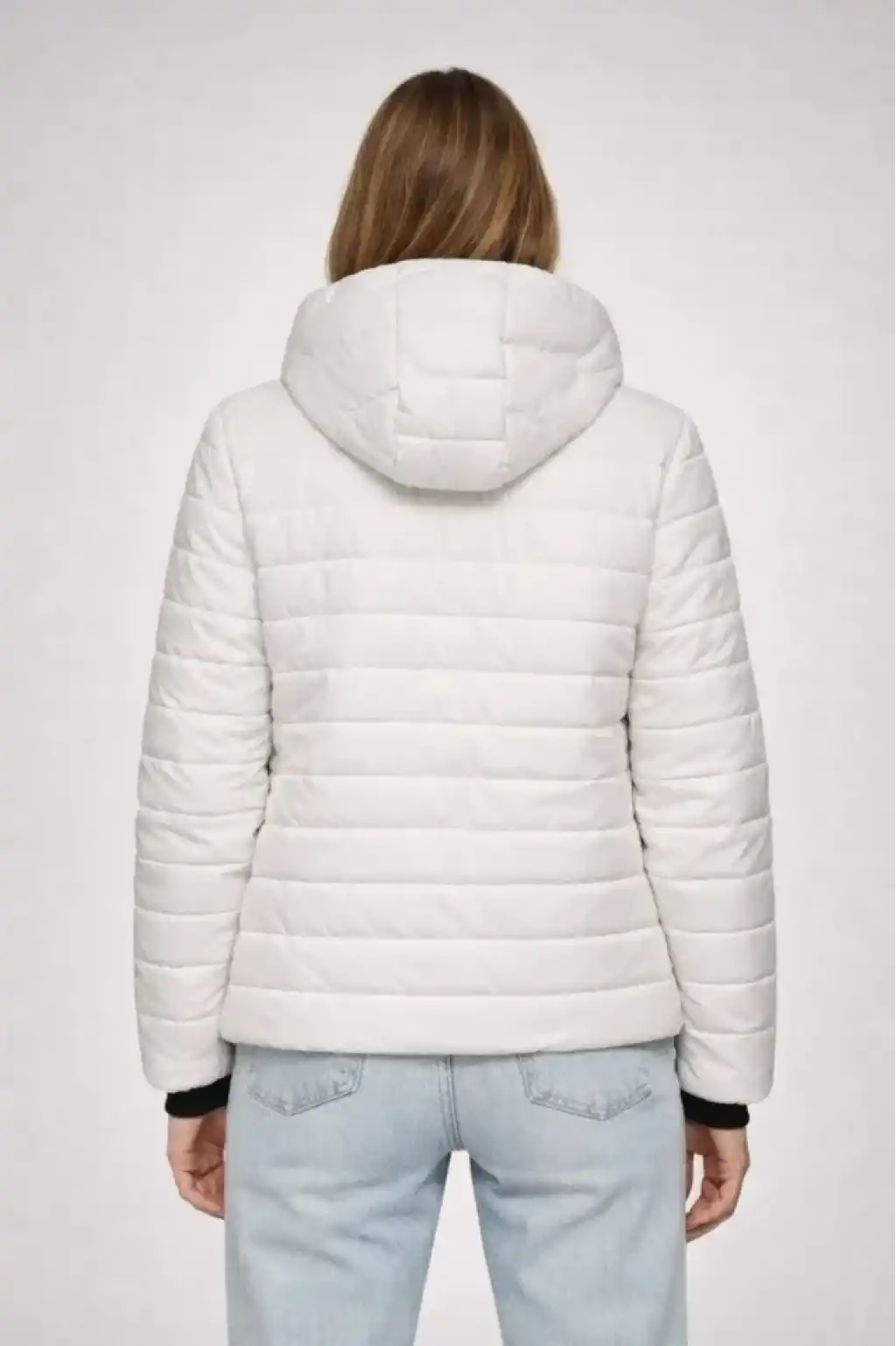 Şişme Kapüşonlu Fermuarlı Mont Su Itici Kapitone Astarlı Kumaş Cepli Kışlık Rahat Kalıp - Krem