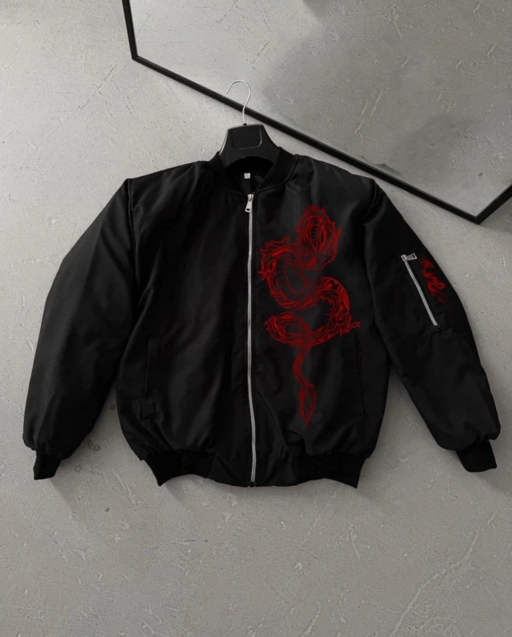 Tam Fermuarlı Uzun Kol Baskılı Bomber Ceket - Siyah