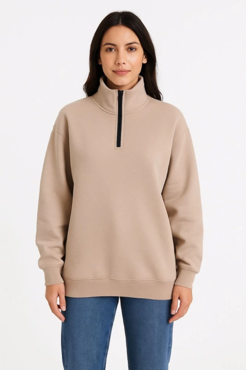 Üç İplik Dık Yaka Yarım Fermuarlı SweatShirt - Bej