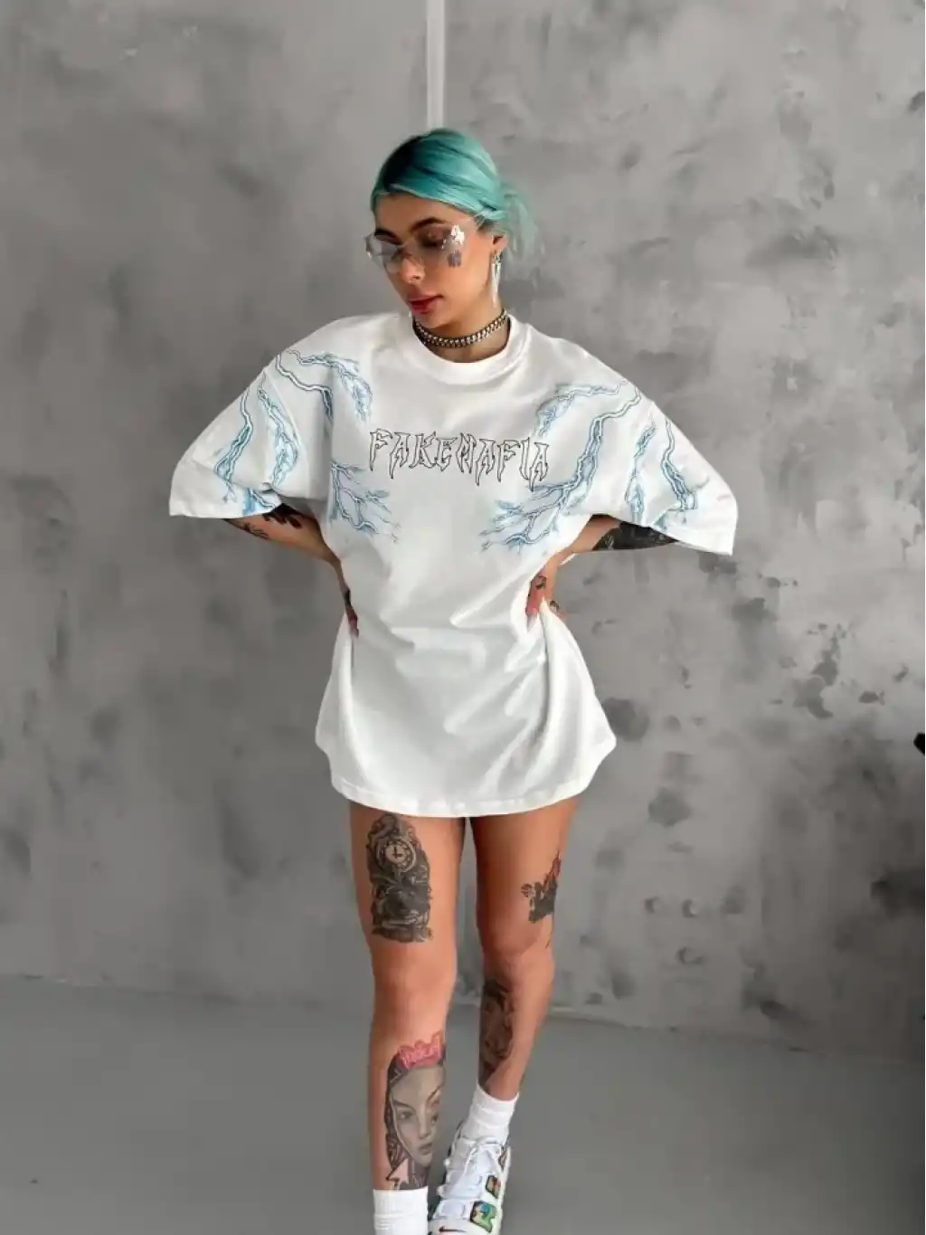 Unisex Bisiklet Yaka Baskılı Oversize T-Shirt - Beyaz
