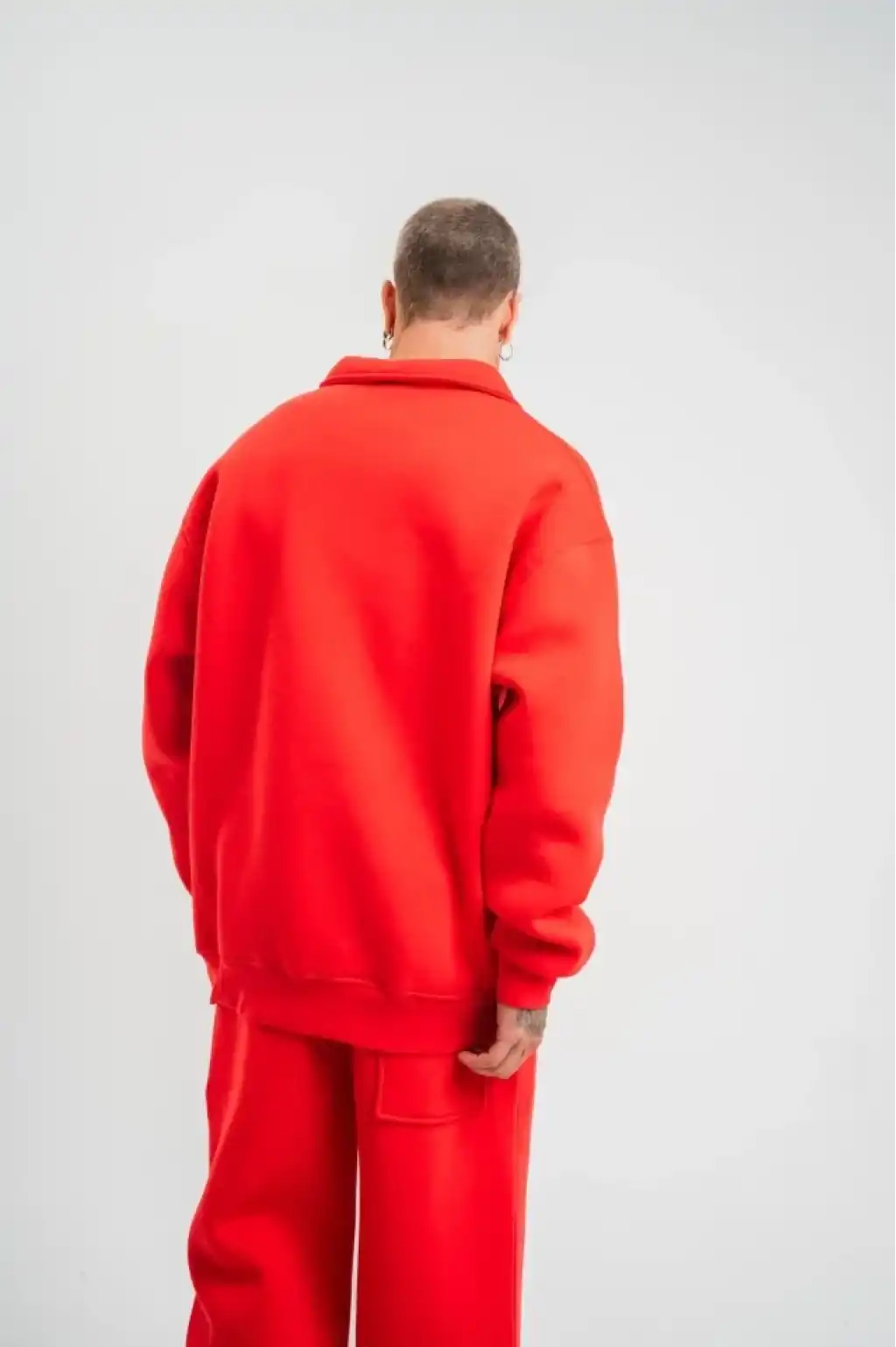 Unisex Üç İplik Parçalı Yakalı SweatShirt - Kırmızı