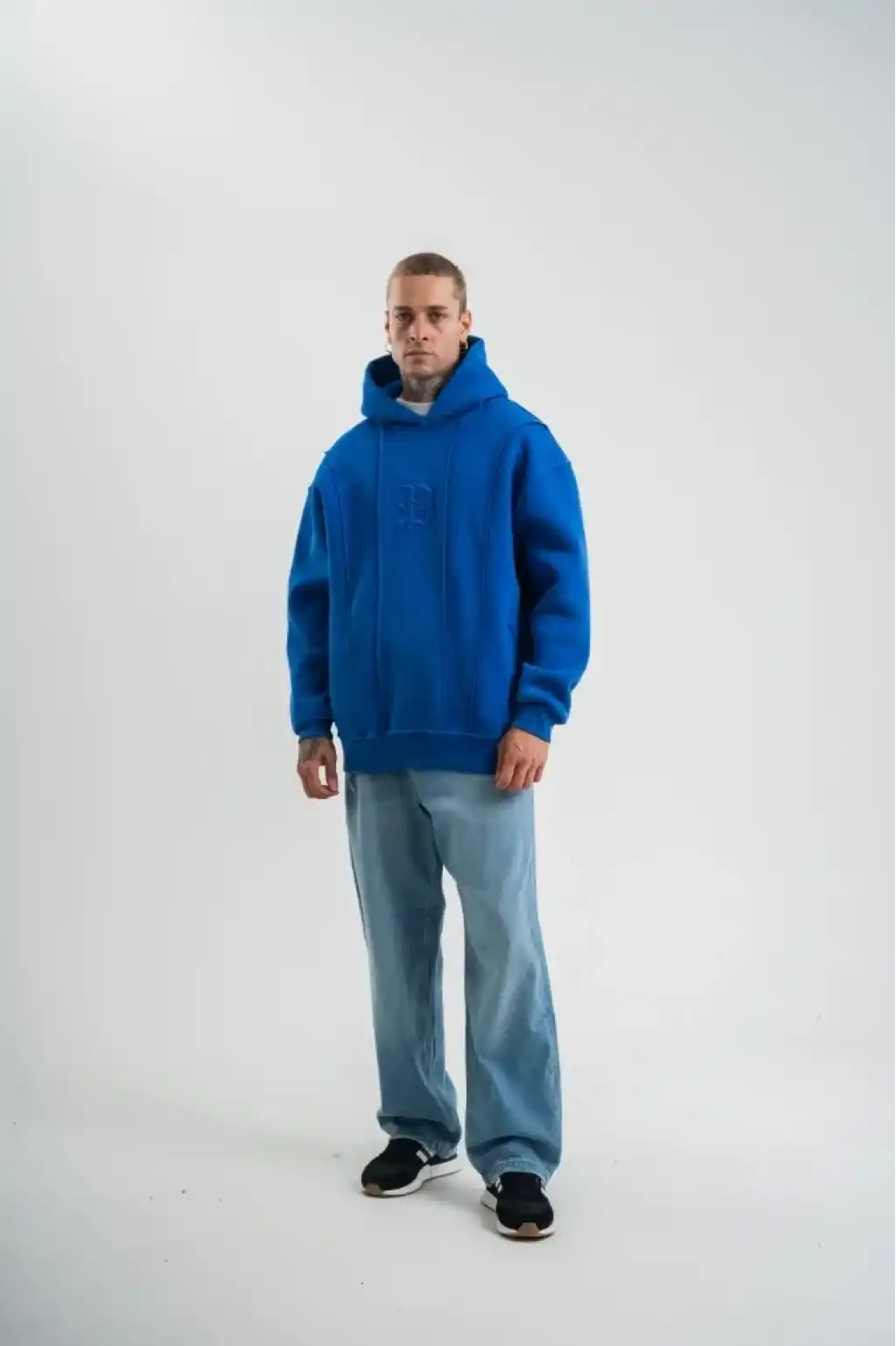Unisex Uzun Kol Kapşonlu Yıkamalı Nakışlı SweatShirt - Mavi