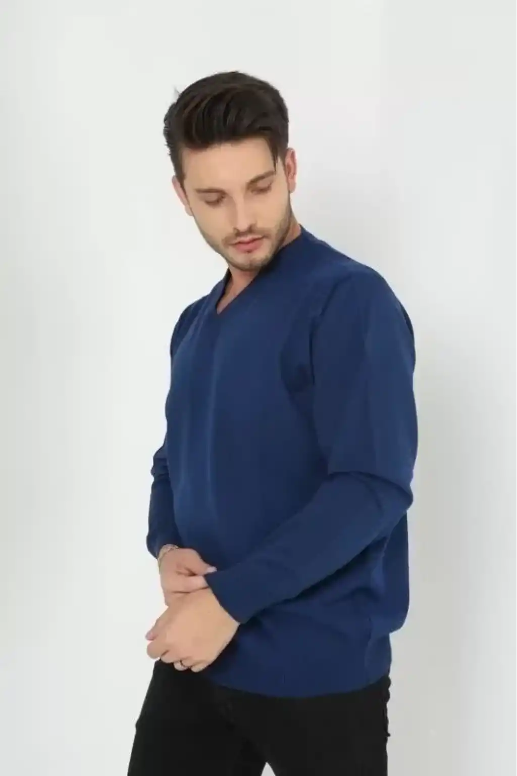 Unisex Uzun Kol V Yaka Triko Kazak - Lacivert