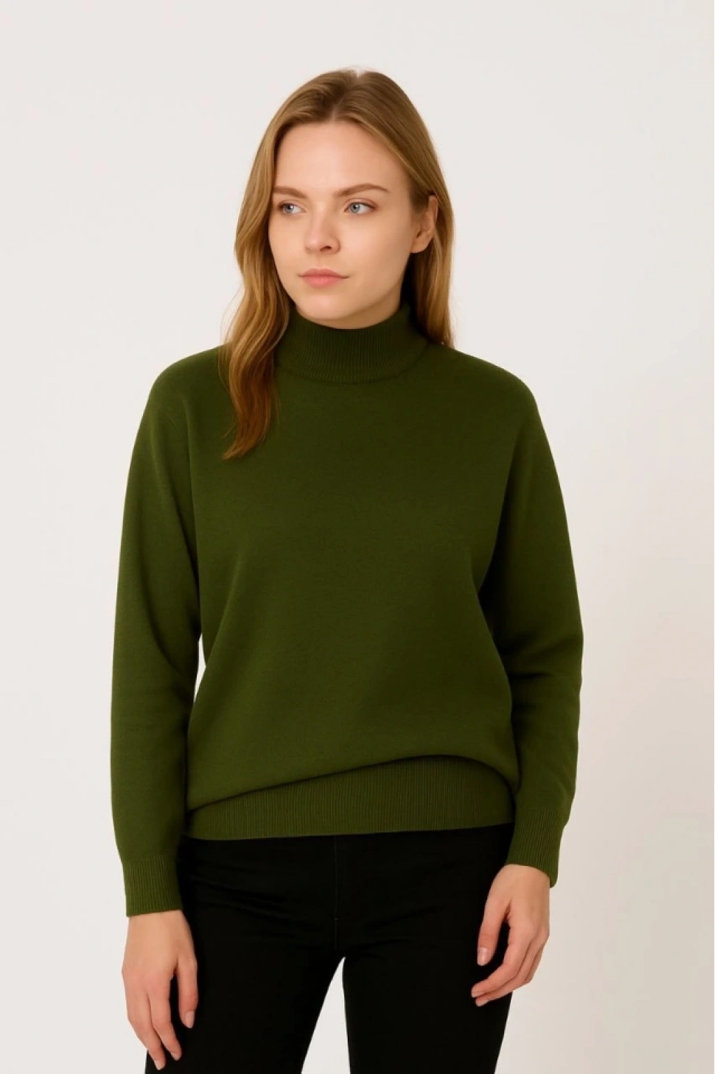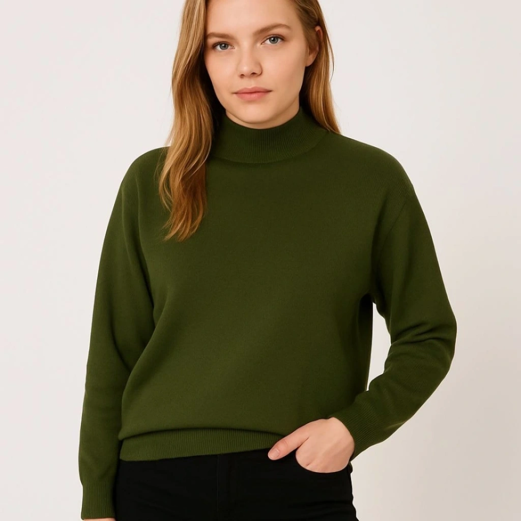 Yarım Boğaz Triko Kazak Yumuşak Dokulu Pamuklu Ince Dokuma, Uzun Kollu Rahat Regular Kalıp - Haki
