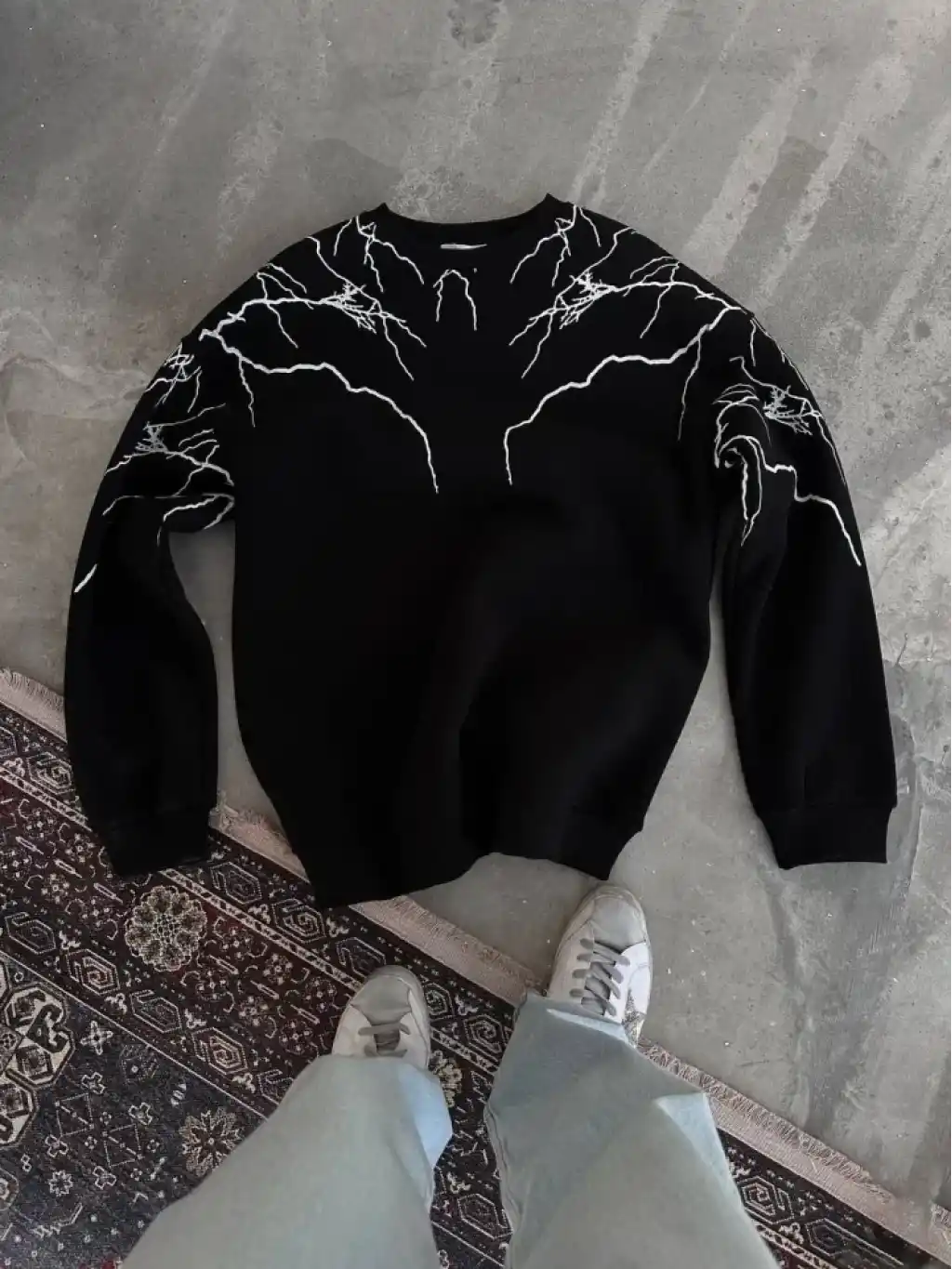 Yıldırım Baskılı Bisiklet Yaka SweatShirt - Siyah